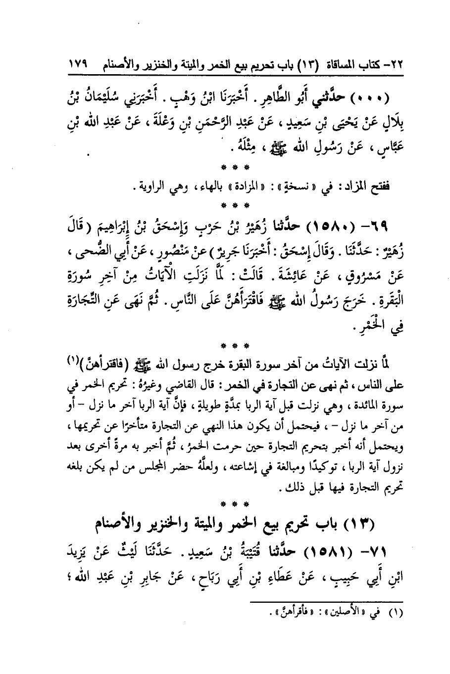 [1580] لما نزلت الْآيَات من آخر سُورَة الْبَقَرَة خرج رَسُول الله صلى الله عَلَيْهِ وَسلم فاقترأهن على النَّاس ثمَّ نهى عَن التِّجَارَة فِي الْخمر قَالَ القَاضِي وَغَيره تَحْرِيم الْخمر فِي سُورَة الْمَائِدَة وَهِي نزلت قبل آيَة الرِّبَا بِمدَّة طَوِيلَة فَإِن آيَة الرِّبَا آخر مَا نزل أَو من آخر مَا نزل فَيحْتَمل أَن يكون هَذَا النَّهْي عَن التِّجَارَة مُتَأَخِّرًا عَن تَحْرِيمهَا وَيحْتَمل أَنه أخبر بِتَحْرِيم التِّجَارَة حِين حرمت الْخمر ثمَّ أخبر بِهِ مرّة أُخْرَى بعد نزُول آيَة الرِّبَا توكيدا ومبالغة فِي إشاعته وَلَعَلَّه حضر الْمجْلس من لم يكن بلغه تَحْرِيم التِّجَارَة فِيهَا قبل ذَلِك