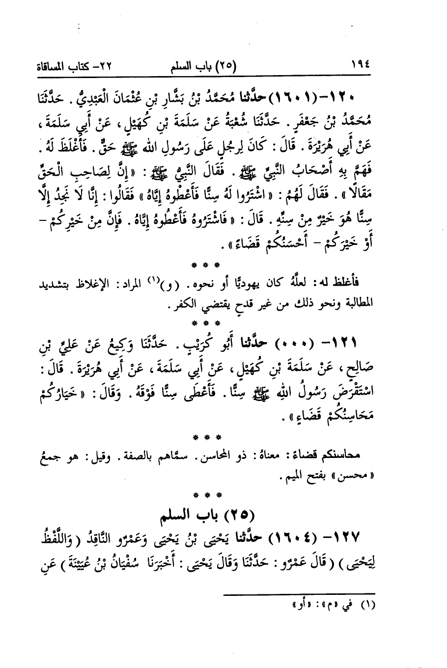 [1601] فَأَغْلَظ لَهُ لَعَلَّه كَانَ يَهُودِيّا أَو نَحوه وَالْمرَاد الإغلاظ بتَشْديد الْمُطَالبَة وَنَحْو ذَلِك من غير قدح يَقْتَضِي الْكفْر محاسنكم قَضَاء مَعْنَاهُ ذُو المحاسن سماهم بِالصّفةِ وَقيل هُوَ جمع محسن بِفَتْح الْمِيم