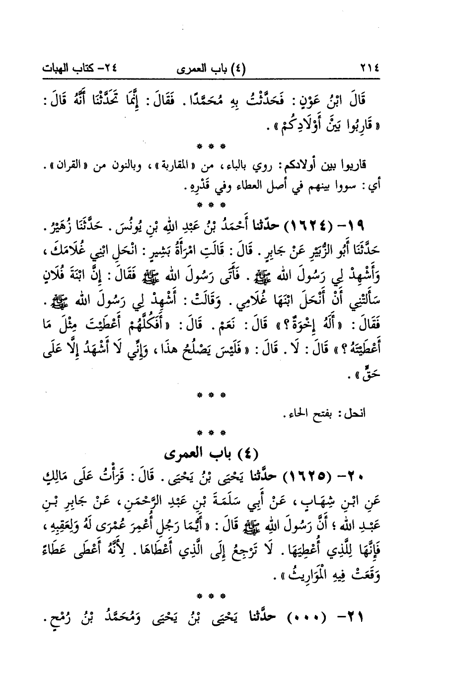 [1623] نحلت أَي وهبت بعض الْمَوْهُوبَة فِي نُسْخَة بعض الْمَوْهُوبَة فالتوى بهَا سنة أَي مطلها لَا أشهد على جور لَيْسَ فِيهِ أَنه حرَام لِأَن الْجور هُوَ الْميل عَن الاسْتوَاء والاعتدال فَكل مَا خرج عَن الِاعْتِدَال فَهُوَ جور سَوَاء كَانَ حَرَامًا أَو مَكْرُوها قاربوا بَين أَوْلَادكُم رُوِيَ الْبَاء من المقاربة وبالنون من الْقرَان أَي سووا بَينهم فِي أصل الْعَطاء وَفِي قدره