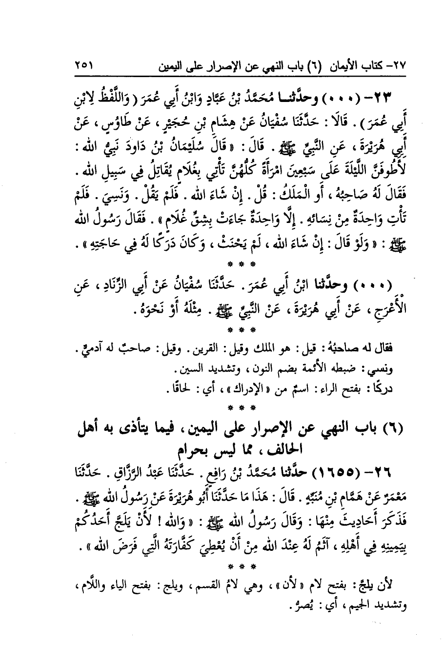 [1654] كَانَ لِسُلَيْمَان عَلَيْهِ الصَّلَاة وَالسَّلَام سِتُّونَ امْرَأَة وَفِي رِوَايَة سَبْعُونَ وَفِي أُخْرَى تسعون وَفِي غير مُسلم مائَة وَفِي تَارِيخ بن عَسَاكِر ألف امْرَأَة قَالَ النَّوَوِيّ وَلَيْسَ بمتعارض لِأَنَّهُ لَيْسَ فِي ذكر الْقَلِيل نفي الْكثير لأطوفن فِي نُسْخَة لأطيفن يُقَال طَاف بالشَّيْء يطوف بِهِ وأطاف بِهِ يطِيف لُغَتَانِ إِذا دَار حوله وَهُوَ هُنَا كِنَايَة عَن الْجِمَاع فَولدت نصف إِنْسَان قَالَ النَّوَوِيّ قيل هُوَ الْجَسَد الَّذِي ألْقى الله على كرسيه لَو كَانَ اسْتثْنى لولدت قَالَ النَّوَوِيّ هَذَا مَحْمُول على أَن النَّبِي صلى الله عَلَيْهِ وَسلم أُوحِي إِلَيْهِ بذلك فِي حق سُلَيْمَان لَا أَن كل من فعل هَذَا يحصل لَهُ هَذَا فَقَالَ لَهُ صَاحبه قيل هُوَ الْملك وَقيل القرين وَقيل صَاحب لَهُ آدَمِيّ وَنسي ضَبطه الْأَئِمَّة بِضَم النُّون وَتَشْديد السِّين دركا بِفَتْح الرَّاء اسْم من الْإِدْرَاك أَي لحَاقًا