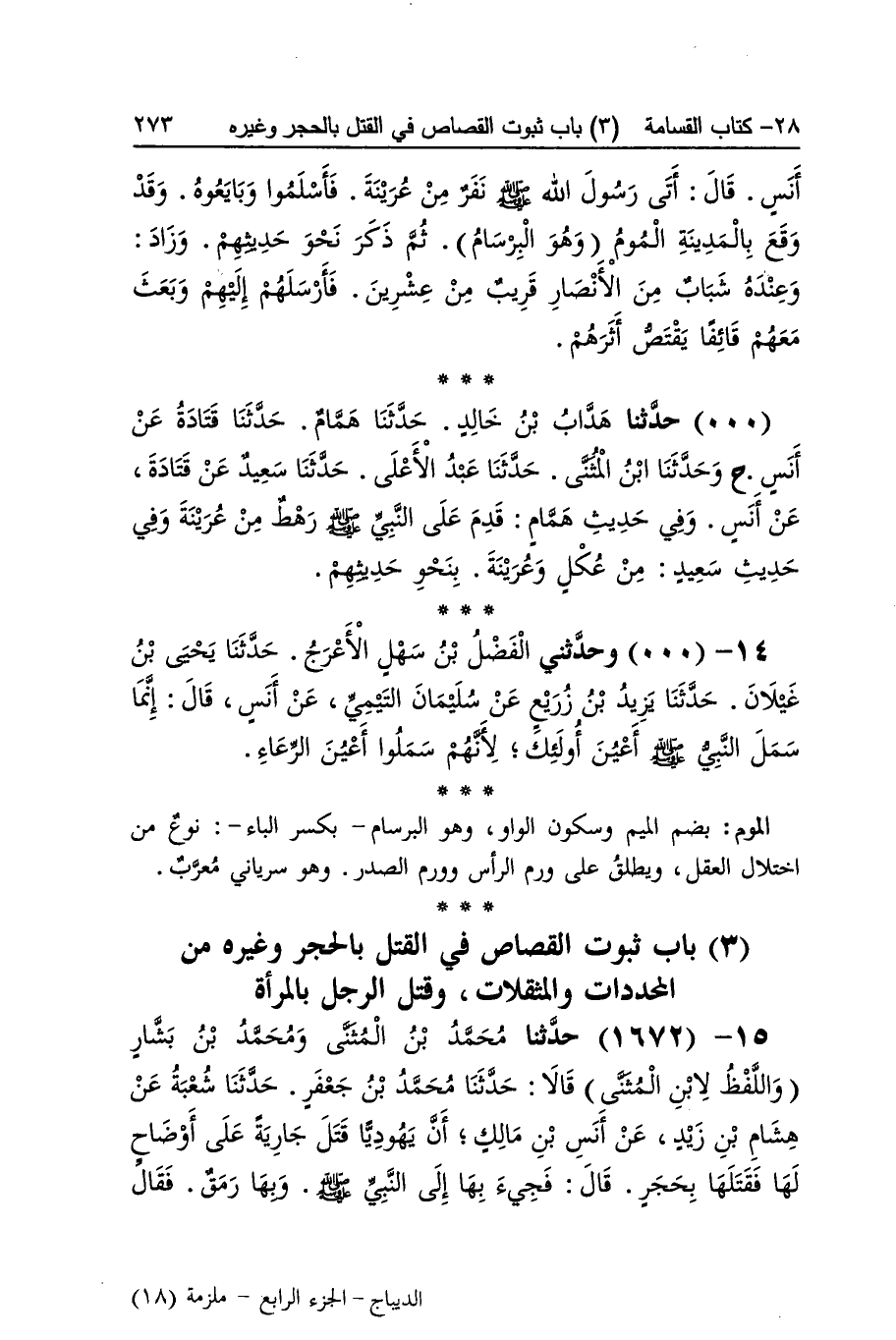 [1671] من عرينة بِضَم الْعين الْمُهْملَة وَفتح الرَّاء وياء تحتية وَنون وهاء قَبيلَة مَعْرُوفَة فاجتووها بِالْجِيم والمثناة فَوق أَي استوخموها من الجوى وَهُوَ دَاء فِي الْجوف على الرعاء بِضَم الرَّاء وَفِي نُسْخَة الرعاء بِالْكَسْرِ وَالْمدّ وهما لُغَتَانِ فِي جمع رَاع وسمل أَي فَقَأَ وَفِي نُسْخَة وَسمر بالراء وَالْمِيم المخففة أَي كحل بالمسمار بلقاح جمع لقحة بِكَسْر اللَّام وَفتحهَا وَهِي النَّاقة ذَات الدّرّ وَلم يحسمهم أَي لم يكوهم الموم بِضَم الْمِيم وَسُكُون الْوَاو وَهُوَ البرسام بِكَسْر الْبَاء نوع من اختلال الْعقل وَيُطلق على ورم الرَّأْس وورم الصَّدْر وَهُوَ سرياني مُعرب