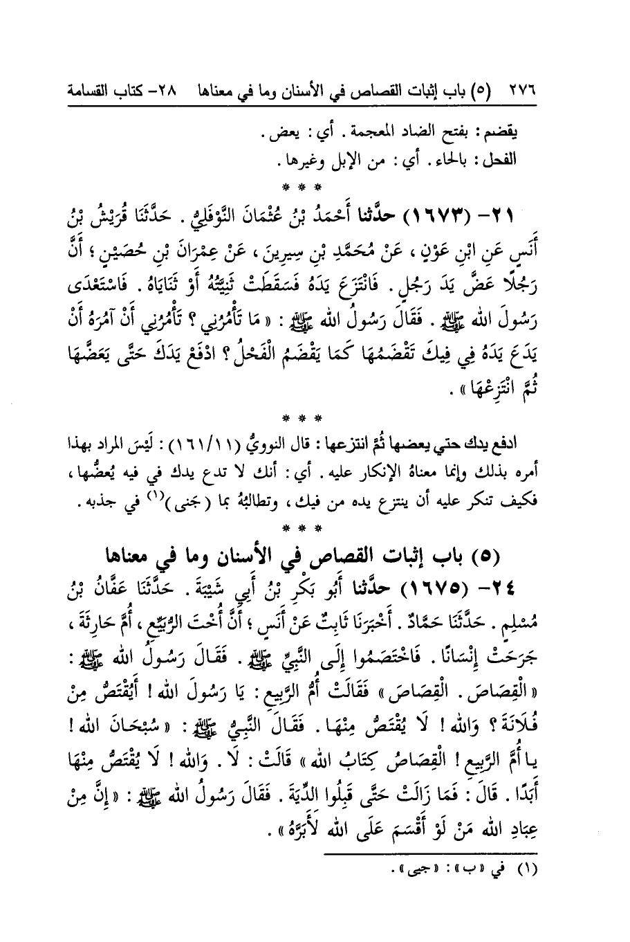 [1674] أَن أَجِيرا ليعلى قَالَ الْحفاظ هَذَا هُوَ الصَّحِيح الْمَعْرُوف أَن المعضوض هُوَ أجِير ليعلى لَا يعلى يقضم بِفَتْح الضَّاد الْمُعْجَمَة أَي يعَض الْفَحْل بِالْحَاء أَي من الْإِبِل وَغَيرهَا