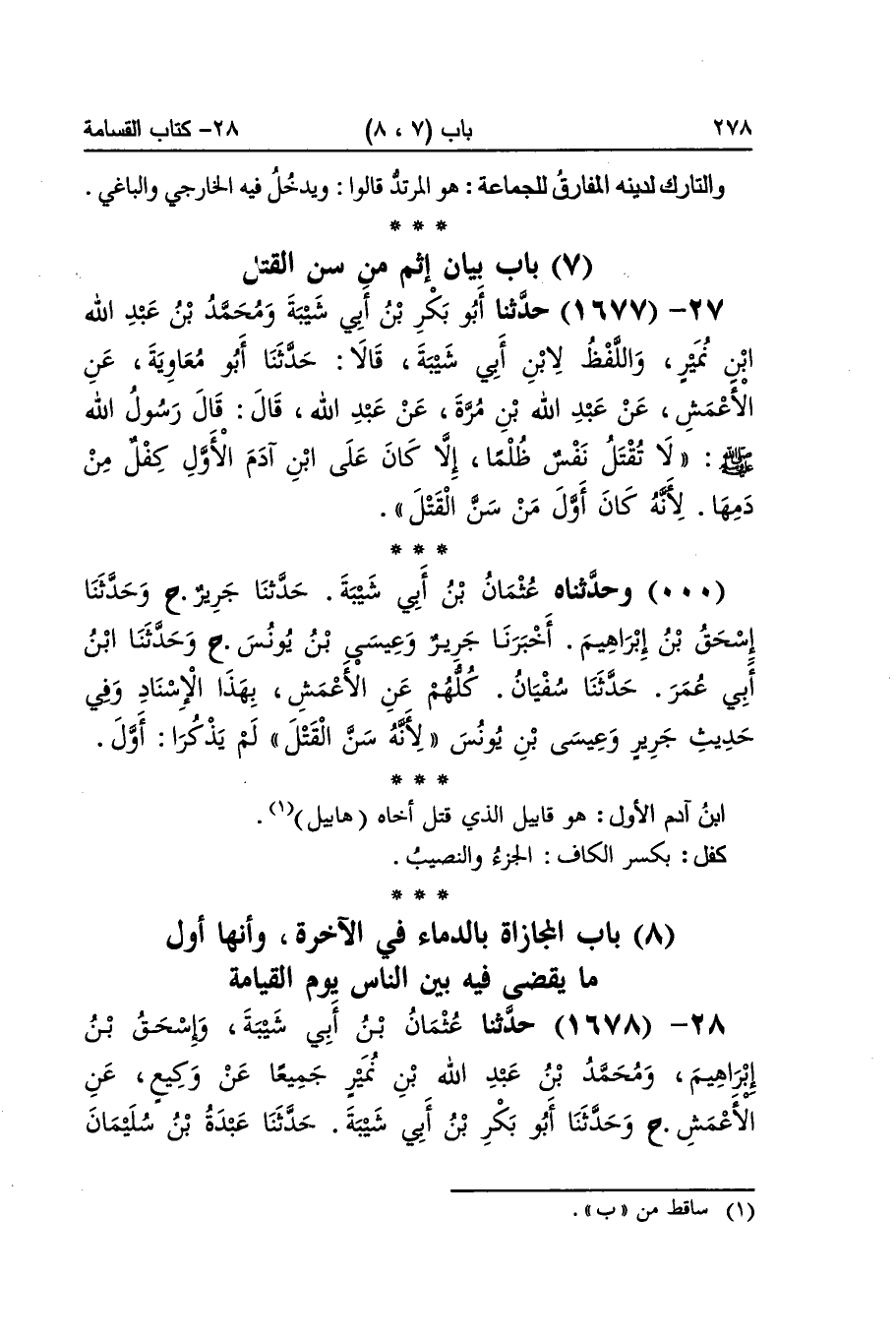 [1677] بن آدم الأول هُوَ قابيل الَّذِي قتل أَخَاهُ هابيل كفل بِكَسْر الْكَاف الْجُزْء والنصيب