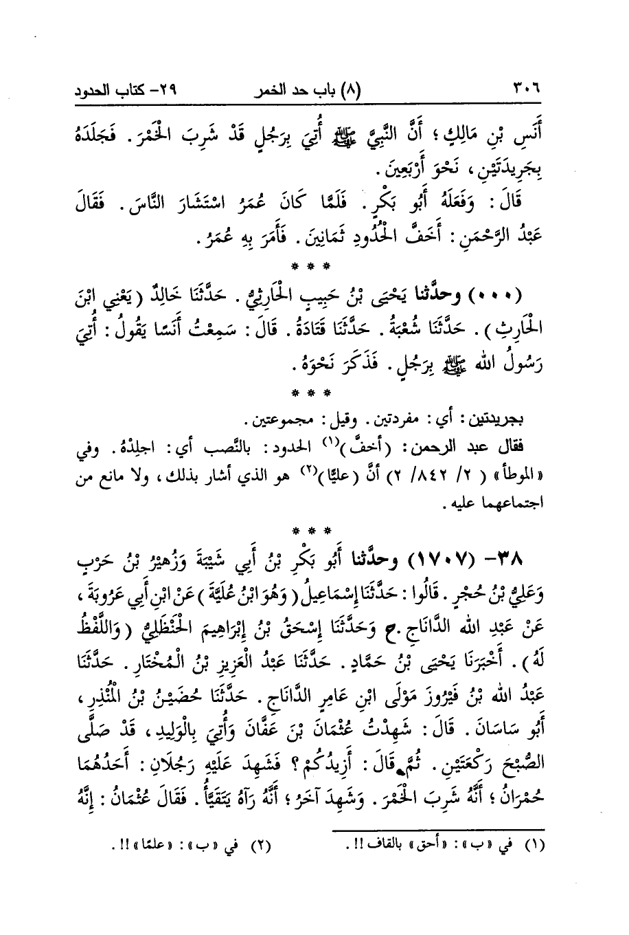 [1706] بجريدتين أَي مفردتين وَقيل مجموعتين فَقَالَ عبد الرَّحْمَن أخف الْحُدُود بِالنّصب أَي اجلده وَفِي الْمُوَطَّأ أَن عليا هُوَ الَّذِي أَشَارَ بذلك وَلَا مَانع من اجْتِمَاعهمَا عَلَيْهِ