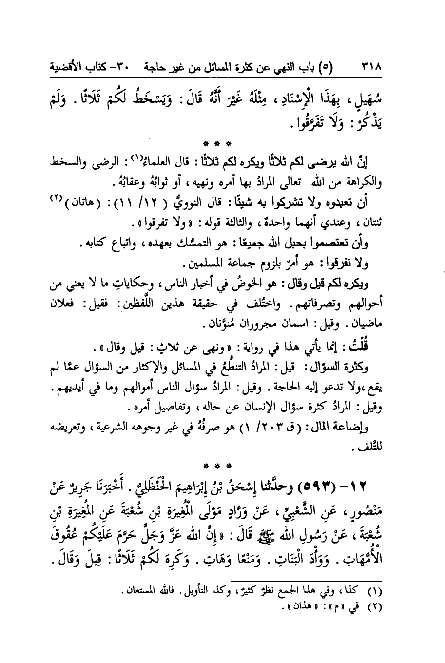 [1715] إِن الله يرضى لكم ثَلَاثًا وَيكرهُ لكم ثَلَاثًا قَالَ الْعلمَاء الرضى والسخط وَالْكَرَاهَة من الله تَعَالَى المُرَاد بهَا أمره وَنَهْيه أَو ثَوَابه وعقابه أَن تَعْبُدُوهُ وَلَا تُشْرِكُوا بِهِ شَيْئا قَالَ النَّوَوِيّ هَاتَانِ ثِنْتَانِ وَعِنْدِي أَنَّهُمَا وَاحِدَة وَالثَّالِثَة قَوْله وَلَا تفَرقُوا وَأَن تعتصموا بِحَبل الله جَمِيعًا هُوَ التَّمَسُّك بعهده وَاتِّبَاع كِتَابه وَلَا تفَرقُوا هُوَ أَمر بِلُزُوم جمَاعَة الْمُسلمين وَيكرهُ لكم قيل وَقَالَ هُوَ الْخَوْض فِي أَخْبَار النَّاس وحكايات مَا لَا يَعْنِي من أَحْوَالهم وتصرفاتهم وَاخْتلف فِي حَقِيقَة هذَيْن اللَّفْظَيْنِ فَقيل فعلان ماضيان وَقيل اسمان مجروران منونان قلت إِنَّمَا يَأْتِي هَذَا فِي رِوَايَة وَنهى عَن ثَلَاث قيل وَقَالَ وَكَثْرَة السُّؤَال قيل المُرَاد التنطع فِي الْمسَائِل والإكثار من السُّؤَال عَمَّا لم يَقع وَلَا تَدْعُو إِلَيْهِ الْحَاجة وَقيل المُرَاد سُؤال النَّاس أموالم وَمَا فِي أَيْديهم وَقيل المُرَاد كَثْرَة سُؤال الْإِنْسَان عَن حَاله وتفاصيل أمره وإضاعة المَال هُوَ صرفه فِي غير وجوهه الشَّرْعِيَّة وتعريضه للتلف