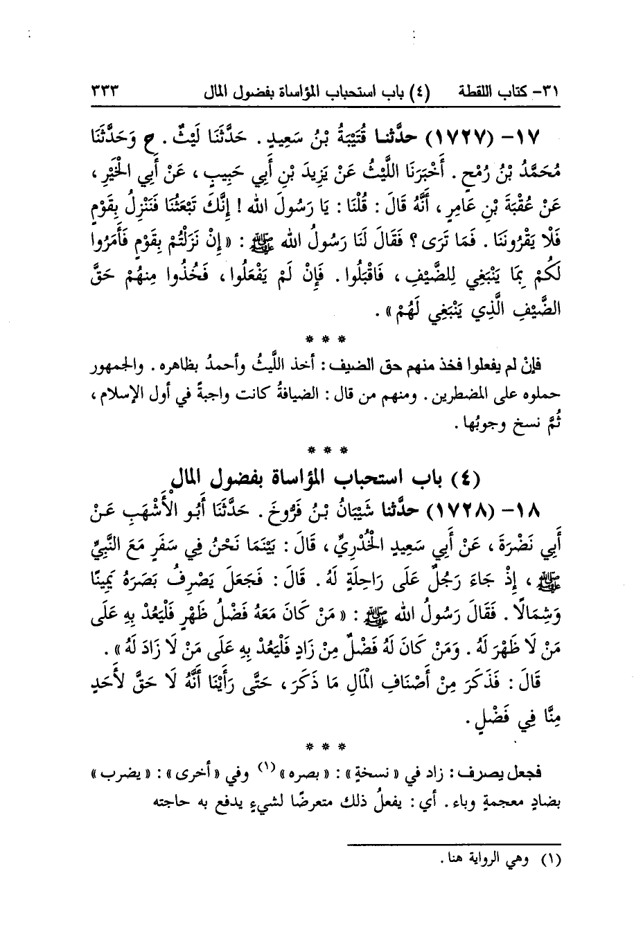 [48] الضِّيَافَة ثَلَاثَة أَيَّام وجائزته يَوْم وَلَيْلَة قَالَ العلماءمعناه الاهتمام بِهِ فِي الْيَوْم وَاللَّيْلَة وإتحافه بِمَا يُمكن من بر وألطاف وَأما فِي الْيَوْم الثَّانِي وَالثَّالِث فيطعمه مَا تيَسّر وَلَا يزِيد على عَادَته يقريه بِفَتْح الْيَاء وَكَذَا يقرونه