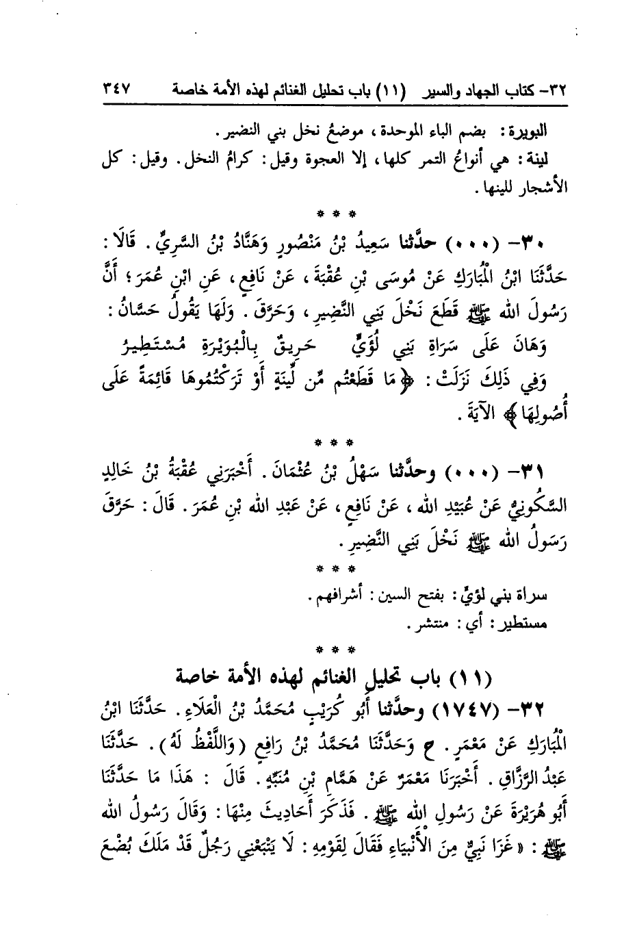 [1746] حرق بتَشْديد الرَّاء البويرة بِضَم الْبَاء الْمُوَحدَة مَوضِع نخل بني النَّضِير لينَة هِيَ أَنْوَاع التَّمْر كلهَا إِلَّا الْعَجْوَة وَقيل كرام النّخل وَقيل كل الْأَشْجَار للينها سراة بني لؤَي بِفَتْح السِّين أَشْرَافهم مستطير أَي منتشر