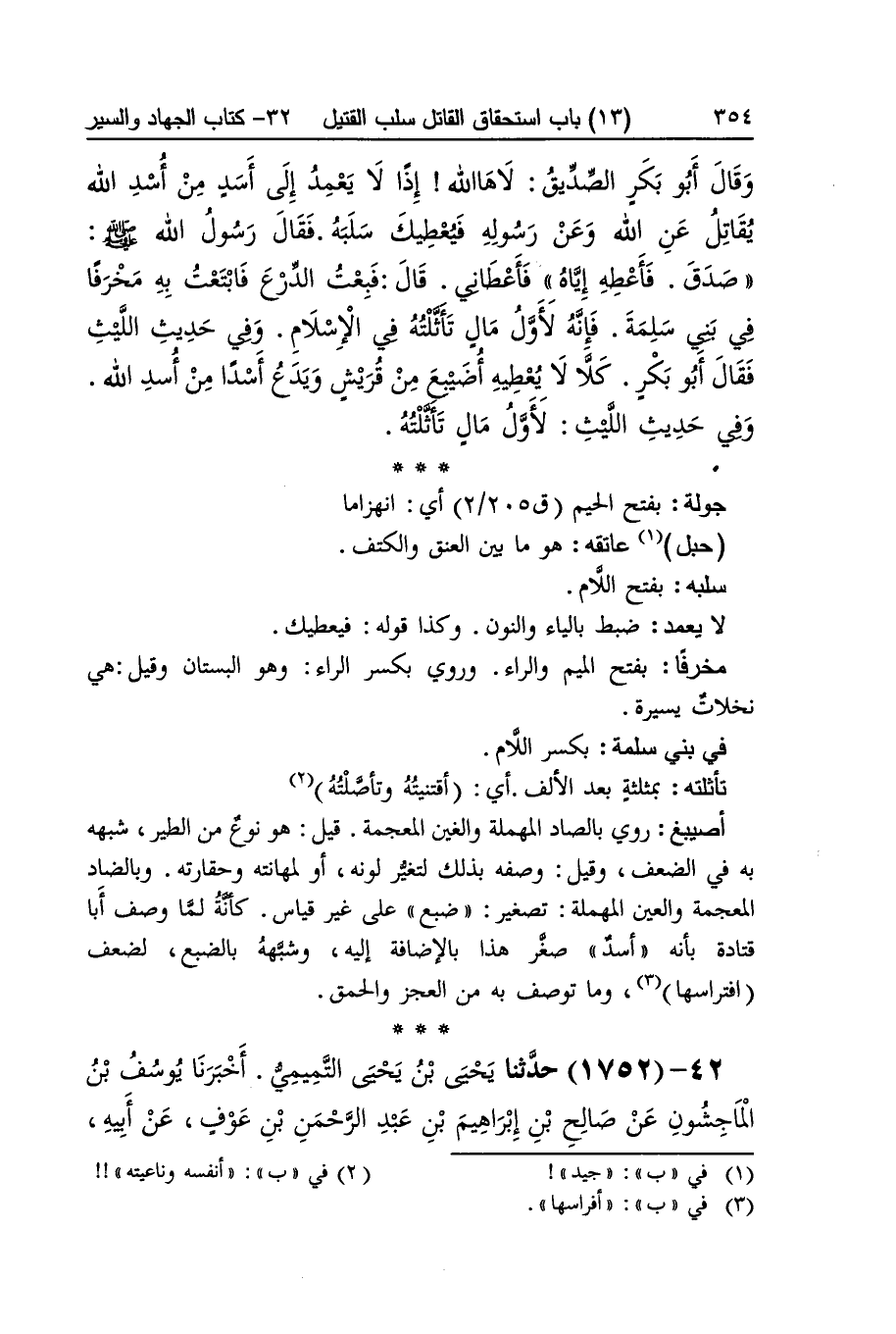 [1751] جَوْلَة بِفَتْح الْجِيم أَي انهزاما حَبل عَاتِقه هُوَ مَا بَين الْعُنُق والكتف سلبه بِفَتْح اللَّام لَا يعمد ضبط بِالْيَاءِ وَالنُّون وَكَذَا قَوْله فيعطيك مخرفا بِفَتْح الْمِيم وَالرَّاء وَرُوِيَ بِكَسْر الرَّاء وَهُوَ الْبُسْتَان وَقيل هِيَ نخلات يسيرَة فِي بني سَلمَة بِكَسْر اللَّام تأثلته بمثلثة بعد الْألف أَي أقتنيته وتأصلته أصيبغ رُوِيَ بالصَّاد الْمُهْملَة والغين الْمُعْجَمَة قيل هُوَ نوع من الطير شبهه بِهِ فِي الضعْف وَقيل وَصفه بذلك لتغير لَونه أَو لمهانته وحقارته وبالضاد الْمُعْجَمَة وَالْعين الْمُهْملَة تَصْغِير ضبع على غير قِيَاس كَأَنَّهُ لما وصف أَبَا قَتَادَة بِأَنَّهُ أَسد صغر هَذَا بِالْإِضَافَة إِلَيْهِ وَشبهه بالضبع لضعف افتراسها وَمَا تُوصَف بِهِ من الْعَجز والحمق