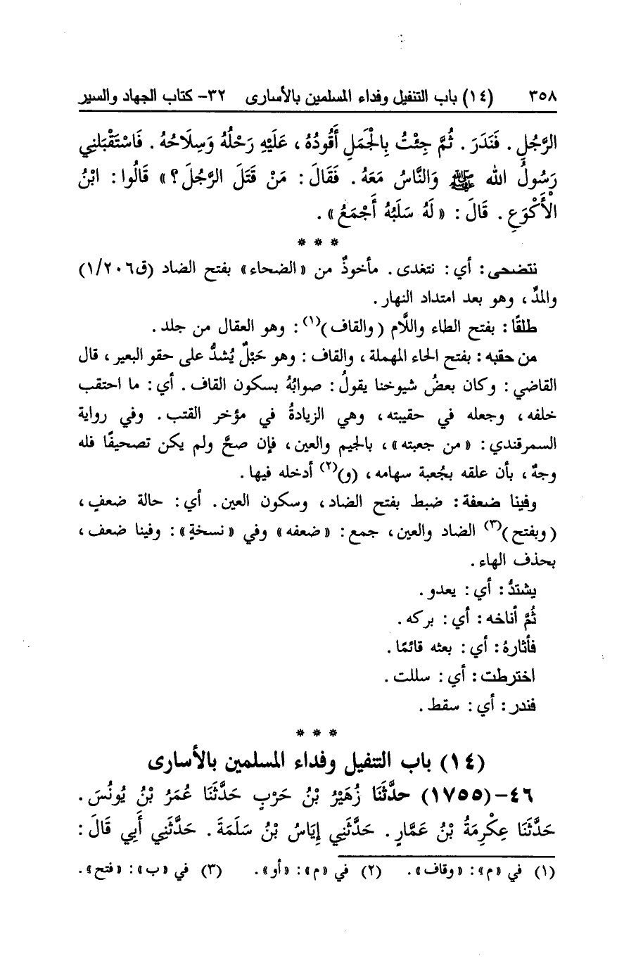 [1754] نتضحى أَي نتغدى مَأْخُوذ من الضحاء بِفَتْح الضَّاد وَالْمدّ وَهُوَ بعد امتداد النَّهَار طلقا بِفَتْح الطَّاء وَاللَّام وَالْقَاف وَهُوَ العقال من جلد من حقبه بِفَتْح الْحَاء الْمُهْملَة وَالْقَاف وَهُوَ حَبل يشد على حقو الْبَعِير قَالَ القَاضِي وَكَانَ بعض شُيُوخنَا يَقُول صَوَابه بِسُكُون الْقَاف أَي مَا احتقب خَلفه وَجعله فِي حقيبته وَهِي الزِّيَادَة فِي مُؤخر القتب وَفِي رِوَايَة السَّمرقَنْدِي من جعبته بِالْجِيم وَالْعين فَإِن صَحَّ وَلم يكن تصحيفا فَلهُ وَجه بِأَن علقه بجعبة سهامه وَأدْخلهُ فِيهَا وَفينَا ضعفة ضبط بِفَتْح الضَّاد وَسُكُون الْعين أَي حَالَة ضعف وبفتح الضَّاد وَالْعين جمع ضعفه وَفِي نُسْخَة وَفينَا ضعف بِحَذْف الْهَاء يشْتَد أَي يعدو ثمَّ أناخه أَي بركه فأثاره أَي بَعثه قَائِما اخترطت أَي سللت فندر أَي سقط
