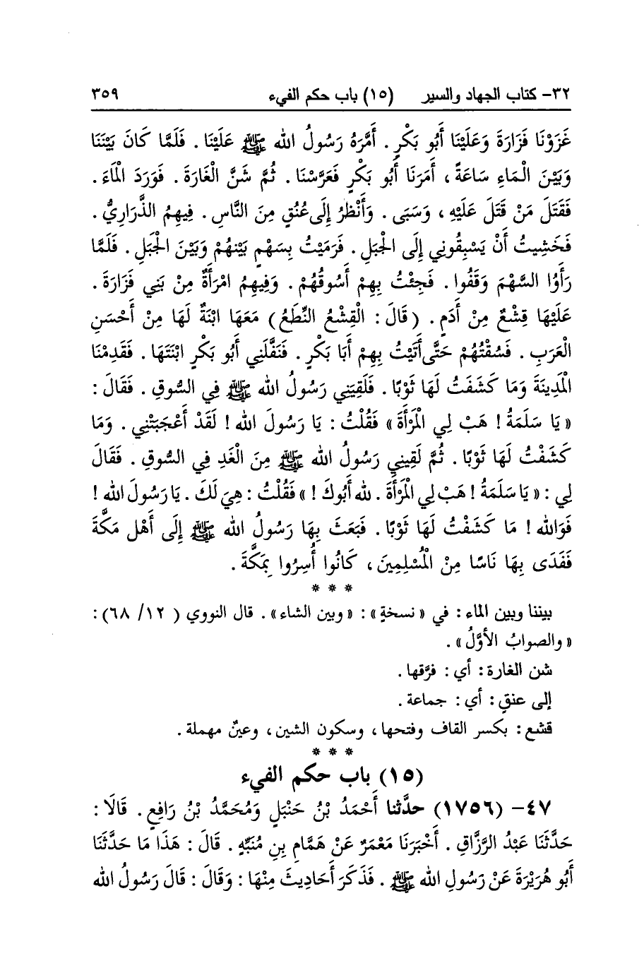 [1755] بَيْننَا وَبَين المَاء فِي نُسْخَة وَبَين الشَّاء قَالَ النَّوَوِيّ وَالصَّوَاب الأول شن الْغَارة أَي فرقها إِلَى عنق أَي جمَاعَة قشع بِكَسْر الْقَاف وَفتحهَا وَسُكُون الشين وَعين مُهْملَة