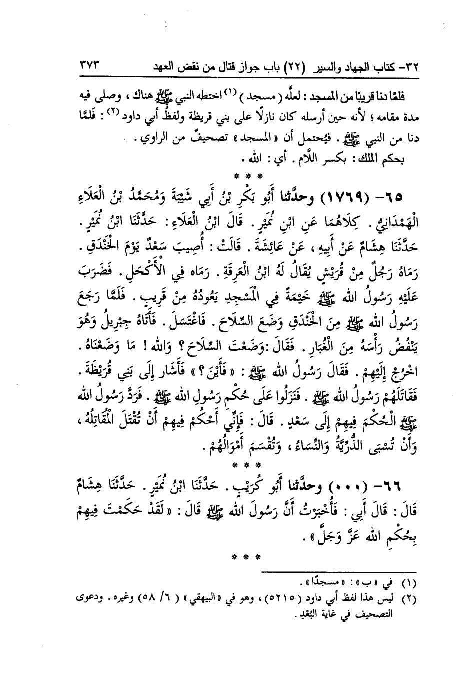 [1768] فَلَمَّا دنا قَرِيبا من الْمَسْجِد لَعَلَّه مَسْجِد اختطه النَّبِي صلى الله عَلَيْهِ وَسلم هُنَاكَ وَصلى فِيهِ مُدَّة مقَامه لِأَنَّهُ حِين أرْسلهُ كَانَ نازلا على بني قريطة وَلَفظ أبي دَاوُد فَلَمَّا دنا من النَّبِي صلى الله عَلَيْهِ وَسلم فَيحْتَمل أَن الْمَسْجِد تَصْحِيف من الرَّاوِي بِحكم الْملك بِكَسْر اللَّام أَي الله
