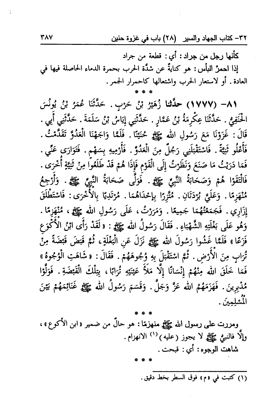 [1776] وأخفاؤهم جمع خَفِيف وهم المسارعون المستعجلون وَرُوِيَ وجفاؤهم بجيم مَضْمُومَة وبالمد وَفسّر بسرعانهم تَشْبِيها بحفاء المسيل وَهُوَ غثاوة وهم حسر بِضَم الْحَاء وَتَشْديد السِّين الْمَفْتُوحَة جمع حاسر أَي بِغَيْر درع رشقا بِفَتْح الرَّاء ومصدر وَقيل بِكَسْرِهَا اسْم للسهام الَّتِي يرميها الْجَمَاعَة دفْعَة وَاحِدَة واستنصر أَي دَعَا أَنا النَّبِي لَا كذب أَنا بن عبد الْمطلب هَذَا مَوْزُون إِلَّا أَنه لم يقْصد فَلَا يُسمى شعرًا لِأَن الشّعْر قصد إِلَيْهِ وَاعْتمد إِيقَاعه مَوْزُونا مقفى وَقَوله أَنا النَّبِي لَا كذب أَي حَقًا فَلَا أفر وَلَا أزول وَإِنَّمَا انتسب إِلَى جده دون أَبِيه لشهرته فَرَمَوْهُ برشق من نبل هُوَ بِكَسْر الرَّاء لَا غير كَأَنَّهَا رجل من جَراد أَي قِطْعَة من جَراد إِذا احمر الْبَأْس هُوَ كِنَايَة عَن شدَّة الْحَرْب بحمرة الدِّمَاء الْحَاصِلَة فِيهَا فِي الْعَادة أَو لاستعار الْحَرْب واشتعالها كاحمرار الْجَمْر