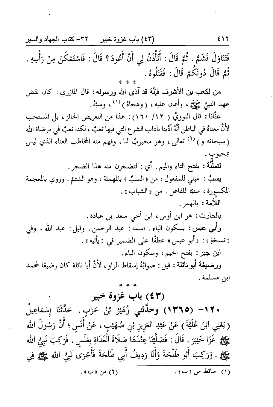 [1801] من لكعب بن الْأَشْرَف فَإِنَّهُ قد آذَى الله وَرَسُوله قَالَ الْمَازرِيّ كَانَ نقض عهد النَّبِي صلى الله عَلَيْهِ وَسلم وأعان عَلَيْهِ وهجاه وسبه عنانا قَالَ النَّوَوِيّ هَذَا من التَّعْرِيض الْجَائِز بل الْمُسْتَحبّ لِأَن مَعْنَاهُ فِي الْبَاطِن أَنه بآداب الشَّرْع الَّتِي فِيهَا تَعب لكنه تَعب فِي مرضاة الله سُبْحَانَهُ وَتَعَالَى وَهُوَ مَحْبُوب لنا وَفهم مِنْهُ الْمُخَاطب العناء الَّذِي لَيْسَ بمحبوب لتملنه بِفَتْح التَّاء وَالْمِيم أَي لتضجرن مِنْهُ هَذَا الضجر يسب مَبْنِيّ للْمَفْعُول من السب بِالْمُهْمَلَةِ وَهُوَ الشتم وَرُوِيَ بِالْمُعْجَمَةِ الْمَكْسُورَة مَبْنِيا للْفَاعِل من الشَّبَاب اللأمة بِالْهَمْز بِالْحَارِثِ هُوَ بن أَوْس بن أخي سعد بن عبَادَة وَأبي عبس بِسُكُون الْبَاء اسْمه عبد الرَّحْمَن وَقيل عبد الله وَفِي نُسْخَة أَبُو عبس عطفا على الضَّمِير فِي يَأْتِيهِ بن جبر بِفَتْح الْجِيم وَسُكُون الْبَاء ورضيعه أَبُو نائلة قيل صَوَابه إِسْقَاط الْوَاو لِأَن أَبَا نائلة كَانَ رضيعا لمُحَمد بن مسلمة