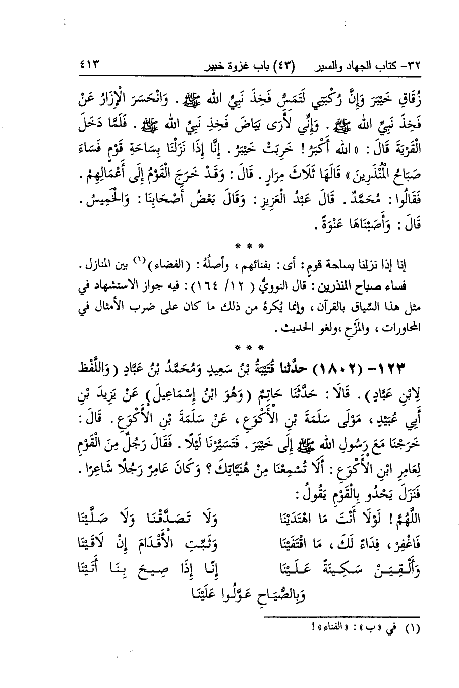 [1365] إِنَّا إِذا نزلنَا بِسَاحَة قوم أَي بفنائهم وَأَصله الفضاء بَين الْمنَازل فسَاء صباح الْمُنْذرين قَالَ النَّوَوِيّ فِيهِ جَوَاز الاستشهاد فِي مثل هَذَا السِّيَاق بِالْقُرْآنِ وَإِنَّمَا يكره من ذَلِك مَا كَانَ على ضرب الْأَمْثَال فِي المحاورات والمزح ولغو الحَدِيث