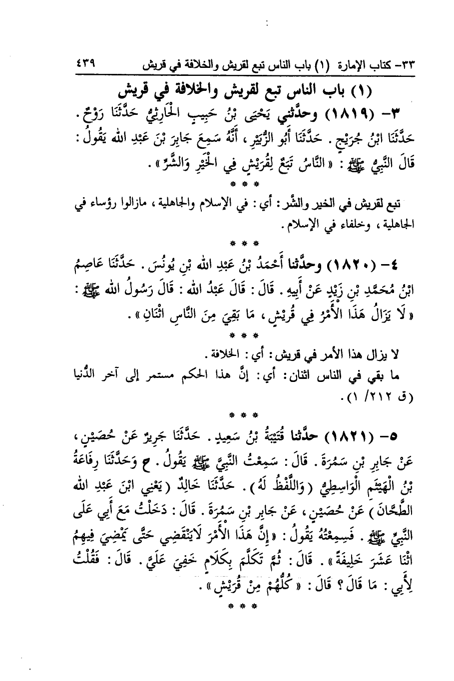 [1820] لَا يزَال هَذَا الْأَمر فِي قُرَيْش أَي الْخلَافَة مَا بَقِي فِي النَّاس اثْنَان أَي إِن هَذَا الحكم مُسْتَمر إِلَى آخر الدُّنْيَا