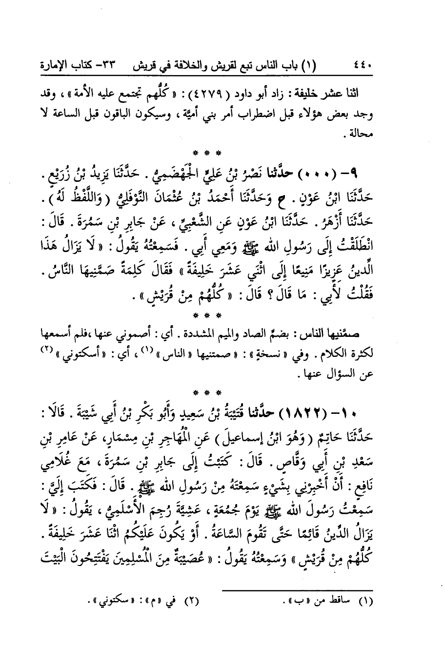 [1821] اثْنَا عشر خَليفَة زَاد أَبُو دَاوُد 4279 كلهم تَجْتَمِع عَلَيْهِ الْأمة وَقد وجد بعض هَؤُلَاءِ قبل اضْطِرَاب أَمر بني أُميَّة وسيكون الْبَاقُونَ قبل السَّاعَة لَا محَالة صمنيها النَّاس بِضَم الصَّاد وَالْمِيم الْمُشَدّدَة أَي أصموني عَنْهَا فَلم أسمعها لِكَثْرَة الْكَلَام وَفِي نُسْخَة صمتنيها النَّاس أَي أسكتوني عَن السُّؤَال عَنْهَا