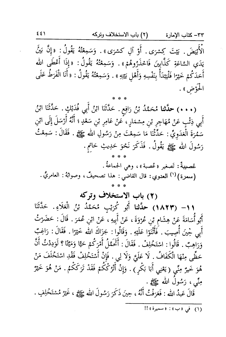 [1822] عصيبة تَصْغِير عصبَة وَهِي الْجَمَاعَة سَمُرَة الْعَدوي قَالَ القَاضِي هذاتصحيف وَصَوَابه العامري