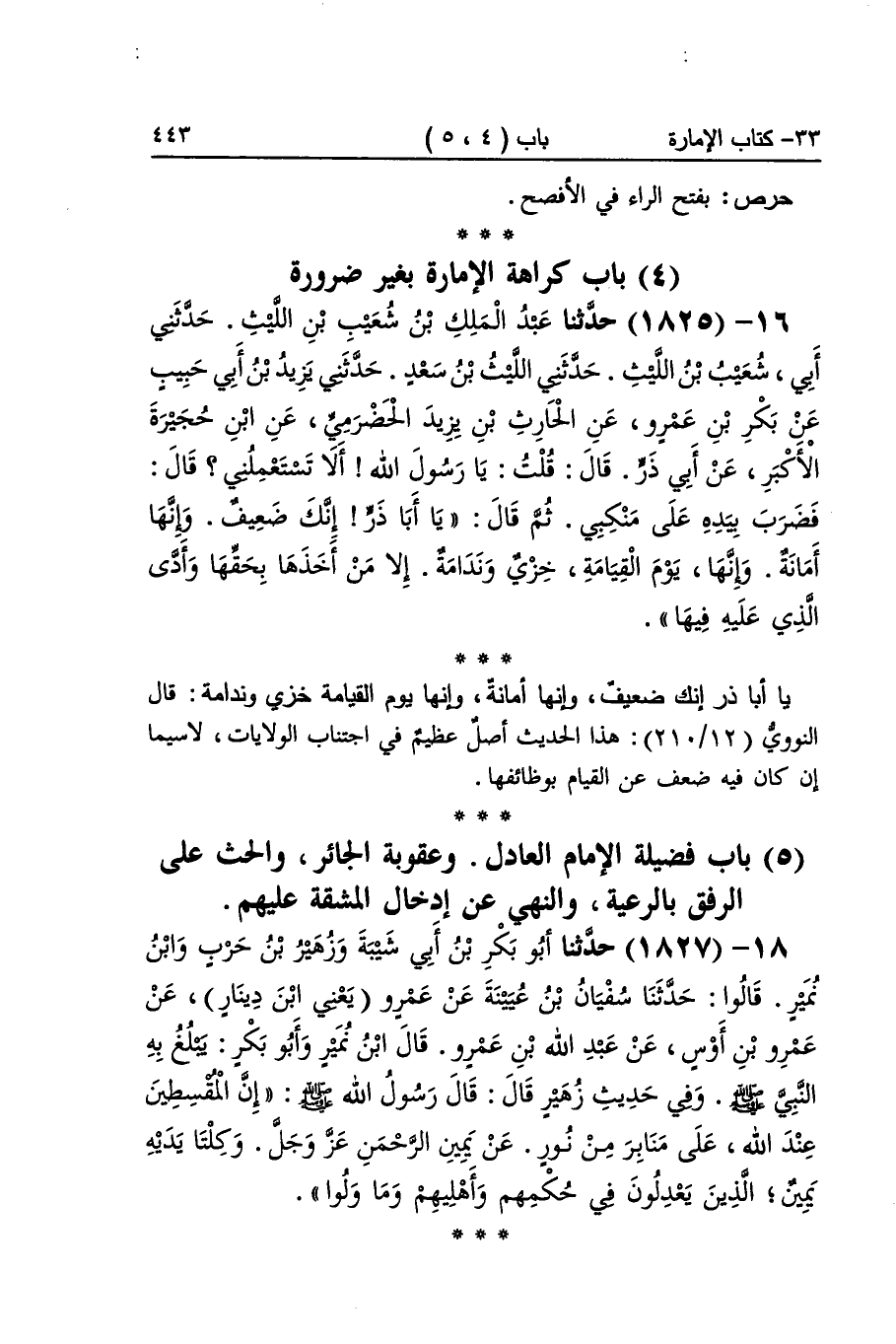 [1825] يَا أَبَا ذَر إِنَّك ضَعِيف وَإِنَّهَا أَمَانَة وَإِنَّهَا يَوْم الْقِيَامَة خزي وندامة قَالَ النَّوَوِيّ هَذَا الحَدِيث أصل عَظِيم فِي اجْتِنَاب الولايات لَا سِيمَا إِن كَانَ فِيهِ ضعف عَن الْقيام بوظائفها
