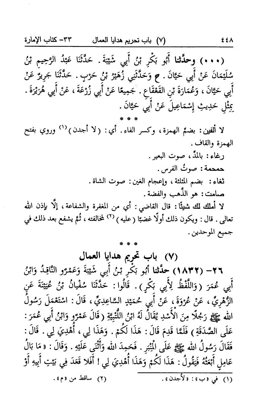 [1831] لَا أَلفَيْنِ بِضَم الْهمزَة وَكسر الْفَاء أَي لَا أجدن وَرُوِيَ بِفَتْح الْهمزَة وَالْقَاف رُغَاء بِالْمدِّ صَوت الْبَعِير حَمْحَمَة صَوت الْفرس ثُغَاء بِضَم الْمُثَلَّثَة وإعجام الْغَيْن صَوت الشَّاة صَامت هُوَ الذَّهَب وَالْفِضَّة لَا أملك لَك شَيْئا قَالَ القَاضِي أَي من الْمَغْفِرَة والشفاعة إِلَّا بِإِذن الله تَعَالَى قَالَ وَيكون ذَلِك أَولا غَضبا عَلَيْهِ لمُخَالفَته ثمَّ يشفع بعد ذَلِك فِي جَمِيع الْمُوَحِّدين