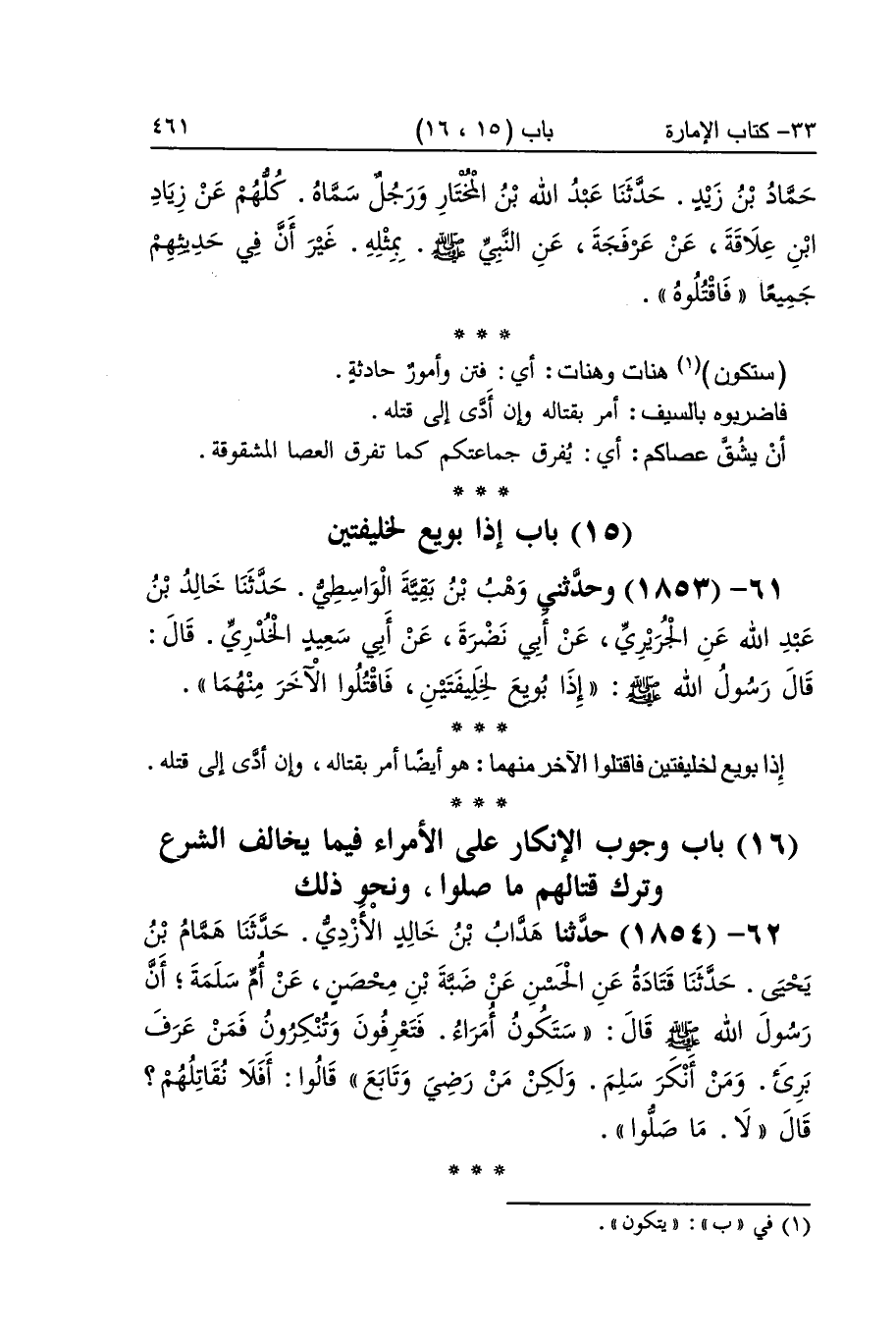 [1853] إِذا بُويِعَ لخليفتين فَاقْتُلُوا الآخر مِنْهُمَا هُوَ أَيْضا أَمر بقتاله وَإِن أدّى إِلَى قَتله