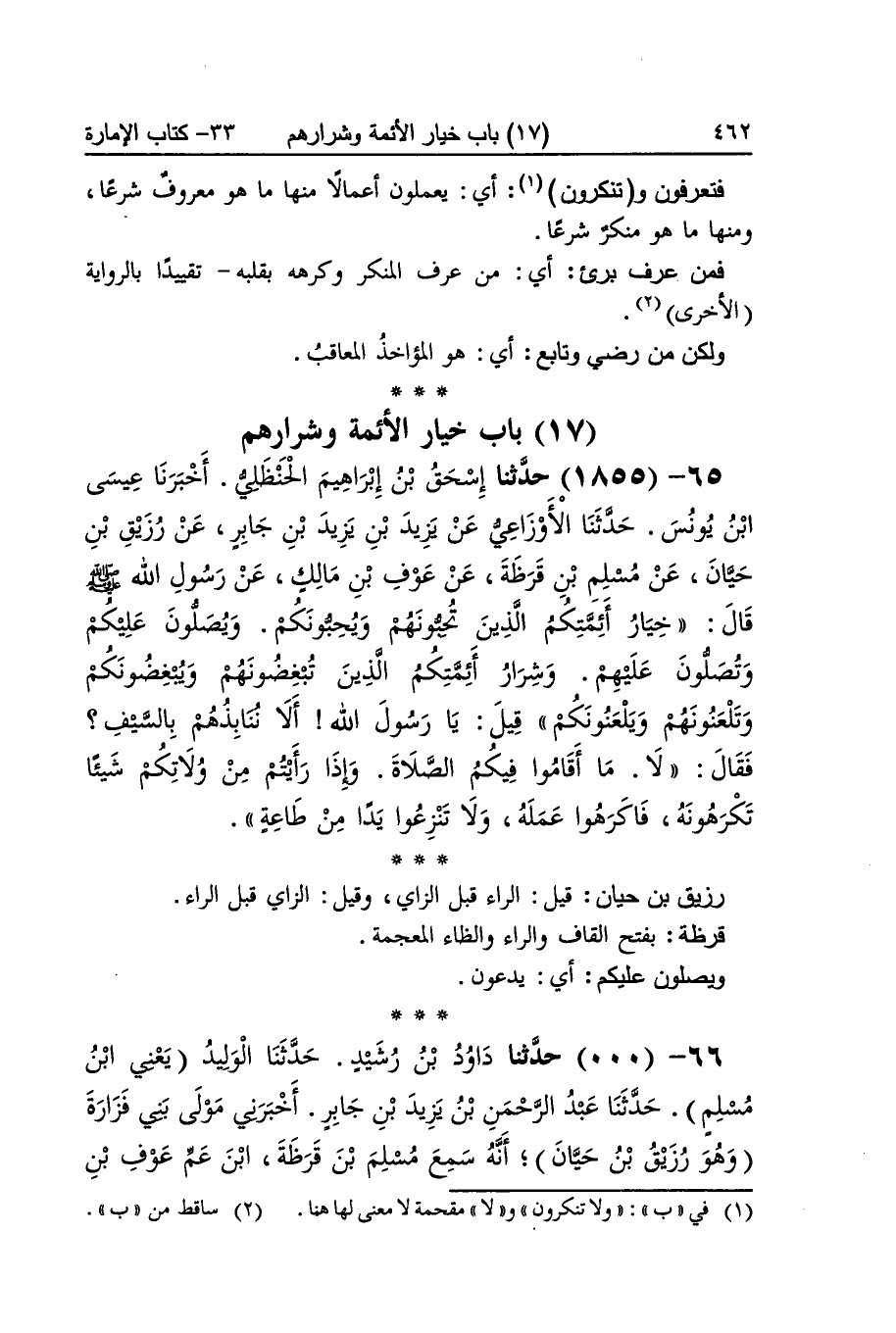 [1854] فتعرفون وتنكرون أَي يعْملُونَ أعمالا مِنْهَا مَا هُوَ مَعْرُوف شرعا وَمِنْهَا مَا هُوَ مُنكر شرعا فَمن عرف بَرِيء أَي من عرف الْمُنكر وَكَرِهَهُ بِقَلْبِه تقييدا بالرواية الْأُخْرَى وَلَكِن من رَضِي وتابع أَي هُوَ المؤاخذ المعاقب