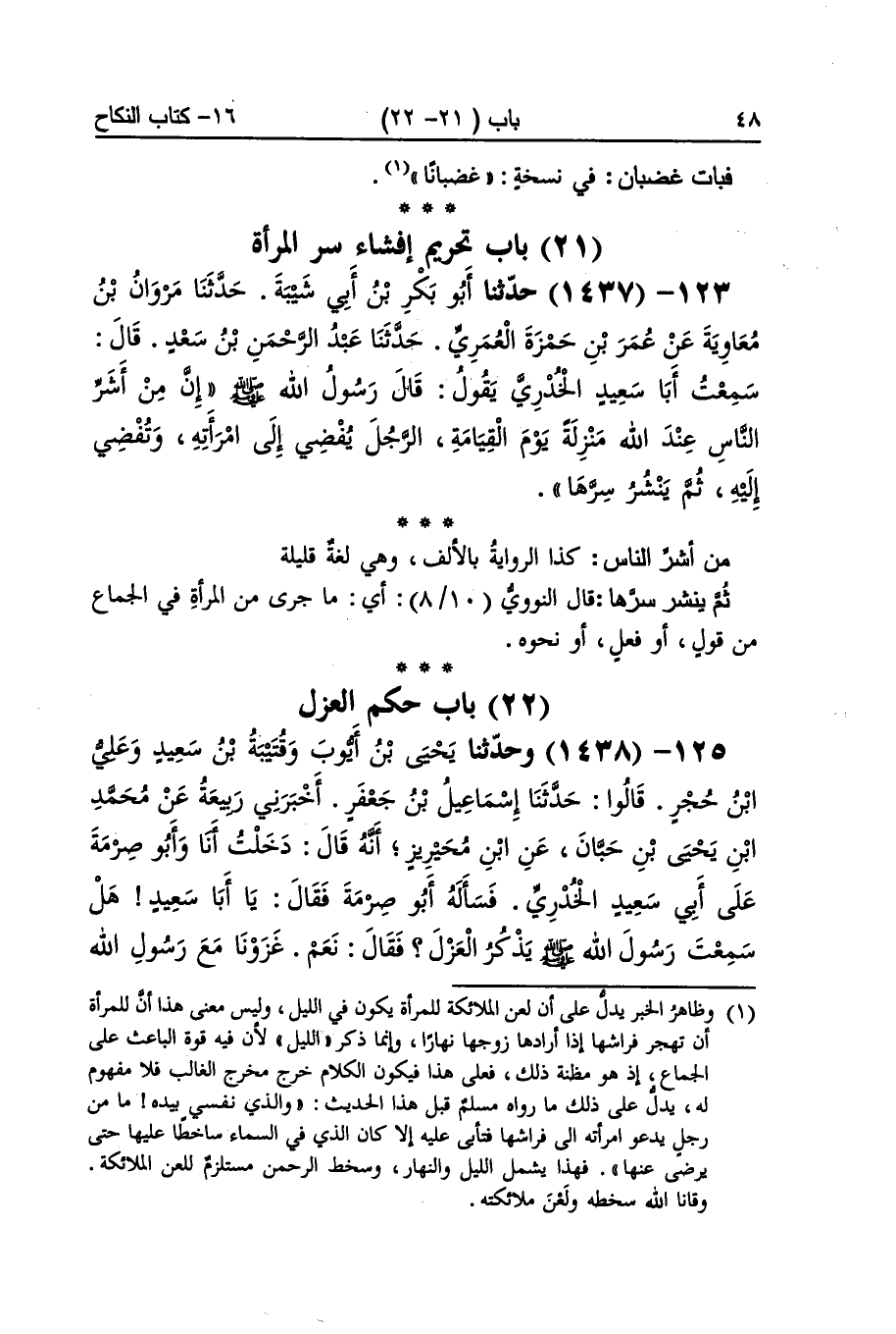 [1437] من أشر النَّاس كَذَا الرِّوَايَة بِالْألف وَهِي لُغَة قَليلَة ثمَّ ينشر سرها قَالَ النَّوَوِيّ أَي مَا جرى من الْمَرْأَة فِي الْجِمَاع من قَول أَو فعل أَو نَحوه