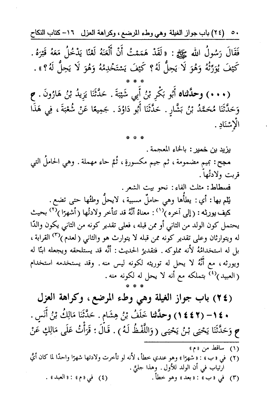 [1441] يزِيد بن خمير بِالْخَاءِ الْمُعْجَمَة مجح بميم مَضْمُومَة ثمَّ جِيم مَكْسُورَة ثمَّ حاء مُهْملَة وَهِي الْحَامِل الَّتِي قربت وِلَادَتهَا فسطاط مثلث الْفَاء نَحْو بَيت الشّعْر يلم بهَا أَي يَطَأهَا وَهِي حَامِل مسبية لَا يحل وَطئهَا حَتَّى تضع كَيفَ يورثه إِلَى آخِره مَعْنَاهُ أَنه قد تتأخر وِلَادَتهَا أشهرا بِحَيْثُ يحْتَمل كَون الْوَلَد من الثَّانِي أَو مِمَّن قبله فعلى تَقْدِير كَونه من الثَّانِي يكون والدا لَهُ ويتوارثان وعَلى تَقْدِير كَونه مِمَّن قبله لَا يتوارث هُوَ وَالثَّانِي لعدم الْقَرَابَة بل لَهُ استخدامه لِأَنَّهُ مَمْلُوكه فتقدير الحَدِيث أَنه قد يستلحقه وبجعله ابْنا لَهُ ويورثه مَعَ أَنه لَا يحل لَهُ توريثه لكَونه لَيْسَ مِنْهُ وَقد يستخدمه اسْتِخْدَام العبيد بتملكه مَعَ أَنه لَا يحل لَهُ لكَونه مِنْهُ
