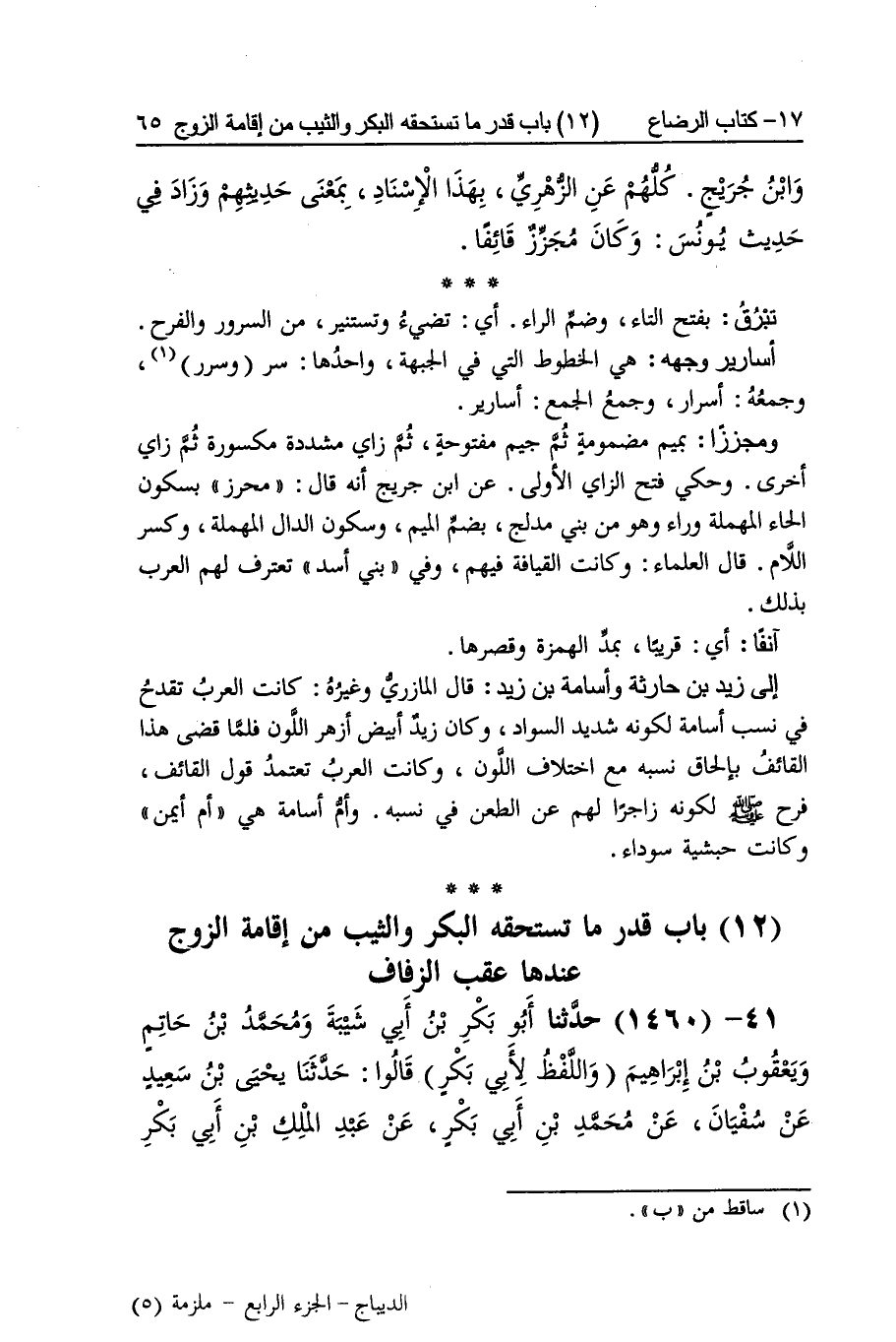 [1459] تبرق بِفَتْح التَّاء وَضم الرَّاء أَي تضيء وتستنير من السرُور والفرح أسارير وَجهه هِيَ الخطوط الَّتِي فِي الْجَبْهَة وَاحِدهَا سر وسرر وَجمعه أسرار وَجمع الْجمع أسارير ومجززا بميم مَضْمُومَة ثمَّ جِيم مَفْتُوحَة ثمَّ زَاي مُشَدّدَة مَكْسُورَة ثمَّ زَاي أُخْرَى وَحكي فتح الزَّاي الأولى عَن بن جريج أَنه قَالَ مُحرز بِسُكُون الْحَاء الْمُهْملَة وَرَاء وَهُوَ من بني مُدْلِج بِضَم الْمِيم وَسُكُون الدَّال الْمُهْملَة وَكسر اللَّام قَالَ الْعلمَاء وَكَانَت القيافة فيهم وَفِي بني أَسد تعترف لَهُم الْعَرَب بذلك آنِفا أَي قَرِيبا بِمد الْهمزَة وقصرها إِلَى زيد بن حَارِثَة وَأُسَامَة بن زيد قَالَ الْمَازرِيّ وَغَيره كَانَت الْعَرَب تقدح فِي نسب أُسَامَة لكَونه شَدِيد السوَاد وَكَانَ زيد أَبيض أَزْهَر اللَّوْن فَلَمَّا قضى هَذَا الْقَائِف بإلحاق نسبه مَعَ اخْتِلَاف اللَّوْن وَكَانَت الْعَرَب تعتمد قَول الْقَائِف فَرح صلى الله عَلَيْهِ وَسلم لكَونه زاجرا لَهُم عَن الطعْن فِي نسبه وَأم أُسَامَة هِيَ أم أَيمن وَكَانَت حبشية سَوْدَاء