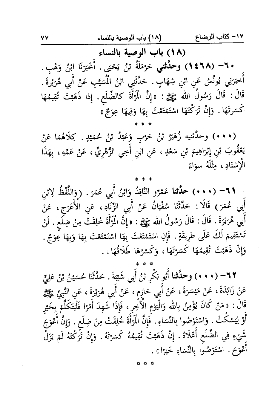 [1466] تنْكح الْمَرْأَة لأَرْبَع قَالَ النَّوَوِيّ الصَّحِيح فِي مَعْنَاهُ أَنه صلى الله عَلَيْهِ وَسلم أخبر بِمَا يَفْعَله النَّاس فِي الْعَادة فَإِنَّهُم يقصدون هَذِه الْخِصَال الْأَرْبَع وَآخِرهَا عِنْدهم ذَات الدّين فاظفر أَنْت أَيهَا المسترشد بِذَات الدّين لَا أَنه أَمر بذلك ولحسبها قَالَ شمر الْحسب الْفِعْل الْجَمِيل للرجل وآبائه ولعابها قَالَ القَاضِي الرِّوَايَة فِي مُسلم بِكَسْر اللَّام لَا غير مصدر لاعب ملاعبة ولعابا وتمشطهن بِفَتْح التَّاء وَضم الشين فَلَمَّا أَقبلنَا فِي رِوَايَة بن ماهان أقفلنا بِالْفَاءِ قطوف بِفَتْح الْقَاف أَي بطيء الْمَشْي بعنزة بِفَتْح النُّون عَصا نَحْو نصف الرمْح أَسْفَل زج المغيبة بِضَم الْمِيم وَكسر الْغَيْن وَسُكُون الْبَاء الَّتِي غَابَ زَوجهَا فالكيس الْكيس أَي جَامع جماعا كيسا قَالَ بَعضهم هَذَا أصل عَظِيم فِي تَحْسِين الْهدى فِي الْجِمَاع وَقيل المُرَاد حثه على الْجِمَاع لابتغاء الْوَلَد أخريات بِضَم الْهمزَة وَفتح الْخَاء