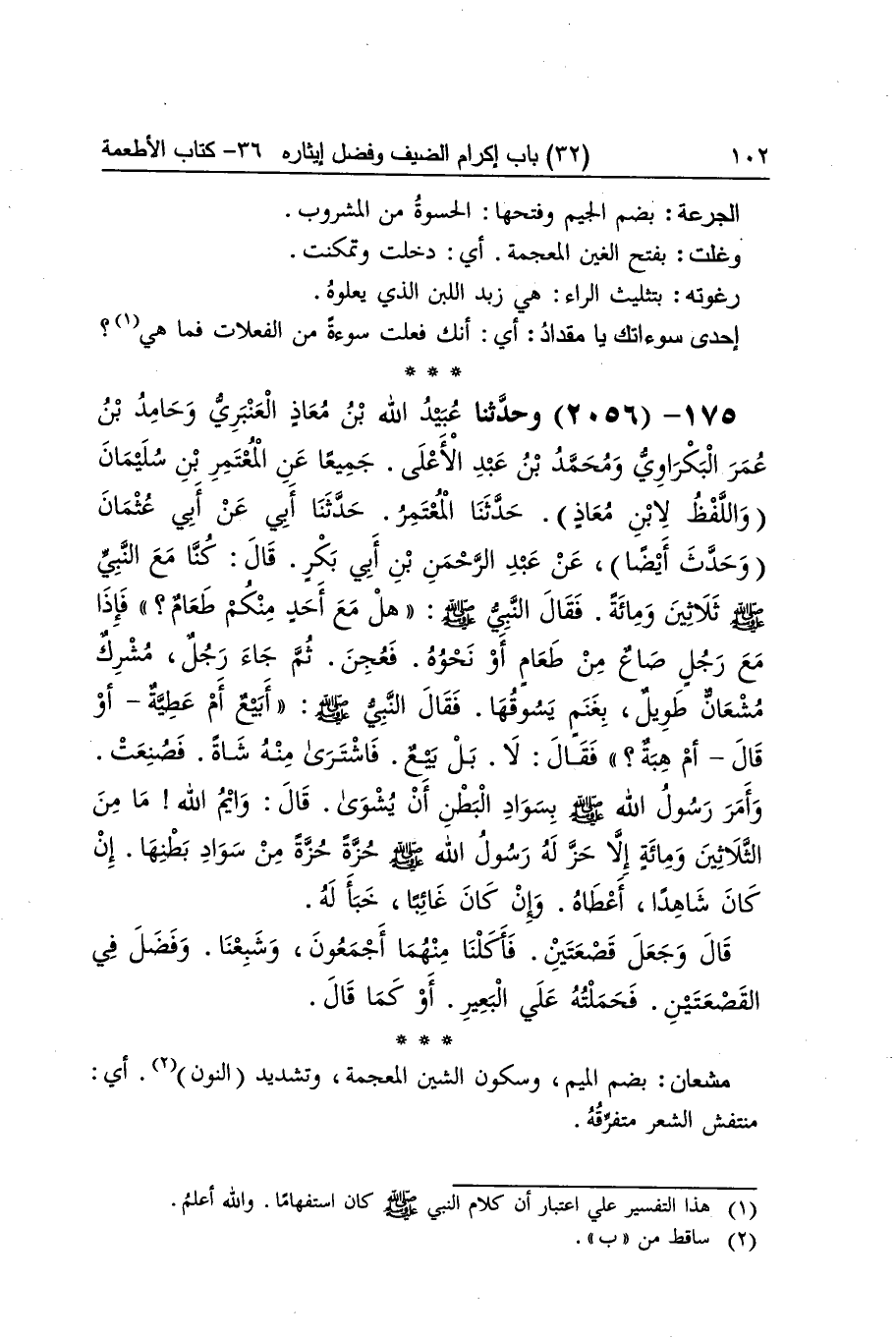 [2055] الجرعة بِضَم الْجِيم وَفتحهَا الحسوة من المشروب وغلت بِفَتْح الْغَيْن الْمُعْجَمَة أَي دخلت وتمكنت رغوته بثليث الرَّاء هِيَ زبد اللَّبن الَّذِي يعلوه إِحْدَى سوءاتك يَا مقداد أَي أَنَّك فعلت سوءة من الفعلات فَمَا هِيَ