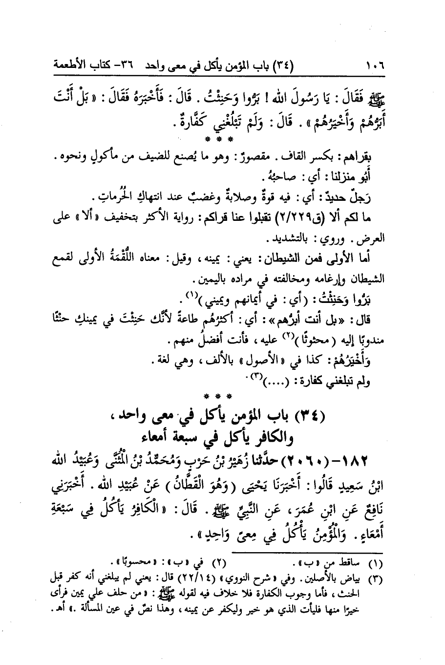 [2057] من كَانَ عِنْده طَعَام اثْنَيْنِ فليذهب بِثَلَاثَة أَي بثالث كَمَا فِي رِوَايَة البُخَارِيّ يَا غنثر بِضَم الْغَيْن الْمُعْجَمَة وَسُكُون النُّون ثمَّ مُثَلّثَة مفتوحةومضمومة وَهُوَ الثقيل الوخم وَقيل الْجَاهِل وَقيل السَّفِيه وَقيل اللَّئِيم وَقيل هُوَ ذُبَاب أَزْرَق وَضَبطه بَعضهم بِفَتْح الْعين وَالْبَاء وَآخَرُونَ بِعَين مُهْملَة ومثناة فَوق مفتوحتين قَالُوا وَهُوَ الذُّبَاب وَقيل هُوَ الْأَزْرَق مِنْهُ شبهه بِهِ تحقيرا لَهُ فجدع أَي دَعَا بالجدع وَهُوَ قطع الْأنف وَغَيره من الْأَعْضَاء وَسَب أَي شتم وَقَالَ كلوا لَا هَنِيئًا قيل هُوَ دُعَاء وَقيل خبر أَي لم تهنوا بِهِ فِي وقته من أَسْفَلهَا أَكثر مِنْهَا ضبط بِالْمُوَحَّدَةِ وبالمثلثة لَا وقرة عَيْني قَالَ أهل اللُّغَة قُرَّة الْعين يعبر بهَا عَن المسرة ورؤية مَا يُحِبهُ الْإِنْسَان وَيُوَافِقهُ وَقيل إِنَّمَا قيل ذَلِك لِأَن عينه تقر لبلوغ أمْنِيته فَلَا يستشرف لشَيْء فَيكون مأخوذا من الْقَرار وَقيل من القر بِالضَّمِّ وَهُوَ البردأي أَن عينه بَارِدَة لسرورها وَعدم تلفهَا قَالَ الْأَصْمَعِي وَغَيره أبرد الله عينه أَي أبرد دمعته لِأَن دمعة الْفَرح بَارِدَة ودمعة الْحزن حارة وَلِهَذَا يُقَال فِي ضِدّه أسخن الله عينه قَالَ الداوودي أَرَادَت بقرة عينهَا النَّبِي صلى الله عَلَيْهِ وَسلم فأقسمت بِهِ وَلَفْظَة لَا زَائِدَة وَيحْتَمل أَنَّهَا نَافِيَة وَفِيه مَحْذُوف أَي لَا شَيْء غير مَا أَقُول وَهُوَ وقرة عَيْني لهي أَكثر مِنْهَا فَعرفنَا اثْنَي عشر بِالْعينِ وَتَشْديد الرَّاء أَي جعلنَا عرفاء وَفِي نُسْخَة بفاء فِي أَوله مكررة وقاف بعد الرَّاء من التَّفْرِيق أَي جعل كل رجل منا مَعَ اثْنَي عشر فرقة بقراهم بِكَسْر الْقَاف مَقْصُور وَهُوَ مَا يصنع للضيف من مَأْكُول وَنَحْوه أَبُو منزلنا أَي صَاحبه رجل حَدِيد أَي فِيهِ قُوَّة وصلابة وَغَضب عِنْد انتهاك الحرمات مَا لكم إِلَّا تقبلُوا عَنَّا قراكم رِوَايَة الْأَكْثَر بتَخْفِيف أَلا على العرضوروي بِالتَّشْدِيدِ أما الأولى فَمن الشَّيْطَان يَعْنِي يَمِينه وَقيل مَعْنَاهُ اللُّقْمَة الأولى لقمع الشَّيْطَان وإرغامه ومخالفته فِي مُرَاده بِالْيَمِينِ بروا وحنثت أَي فِي أَيْمَانهم ويميني قَالَ بل أَنْت أبرهم أَي أَكْثَرهم طَاعَة لِأَنَّك حنثت فِي يَمِينك حنثا مَنْدُوبًا إِلَيْهِ محثوثا عَلَيْهِ فَأَنت أفضل مِنْهُم وأخيرهم كَذَا فِي الْأُصُول بِالْألف وَهِي لُغَة وَلم تبلغني كَفَّارَة