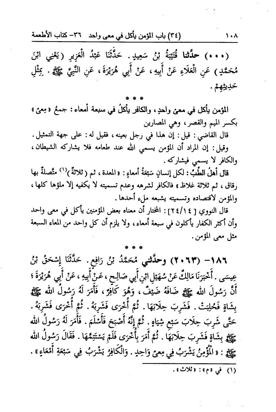 [2062] الْمُؤمن يَأْكُل فِي معي وَاحِد وَالْكَافِر يَأْكُل فِي سَبْعَة أمعاء جمع معي بِكَسْر الْمِيم وَالْقصر وَهِي المصارين قَالَ القَاضِي قيل إِن هَذَا فِي رجل بِعَيْنِه فَقيل لَهُ على جِهَة التَّمْثِيل وَقيل إِن المُرَاد أَن الْمُؤمن يُسَمِّي الله عِنْد طَعَامه فَلَا يُشَارِكهُ الشَّيْطَان وَالْكَافِر لَا يُسَمِّي فيشاركه قَالَ أهل الطِّبّ لكل إِنْسَان سَبْعَة أمعاء الْمعدة ثمَّ ثَلَاثَة مُتَّصِلَة بهَا رقاق ثمَّ ثَلَاثَة غِلَاظ فالكافر لشرهه وَعدم تَسْمِيَته لَا يَكْفِيهِ إِلَّا ملؤُهَا كلهَا وَالْمُؤمن لاقتصاده وتسميته يشبعه ملْء أَحدهَا قَالَ النَّوَوِيّ الْمُخْتَار أَن مَعْنَاهُ بعض الْمُؤمنِينَ يَأْكُل فِي معي وَاحِد وَأَن أَكثر الْكفَّار يَأْكُلُون فِي سَبْعَة أمعاء وَلَا يلْزم أَن كل وَاحِد من المعاء السَّبْعَة مثل معي الْمُؤمن