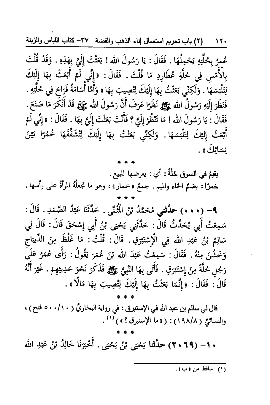 [2068] حلَّة سيراء ضبط حلَّة بِالتَّنْوِينِ وبدونه على الْإِضَافَة وسيراء بِكَسْر السِّين الْمُهْملَة وَفتح الْمُثَنَّاة تَحت وَالرَّاء وَالْمدّ وَهِي برود مضلعة بالحرير وَلَا تكون الْحلَّة إِلَّا ثَوْبَان وَيكون غَالِبا إزارا ورداء من لَا خلاق لَهُ أَي لَا نصيب لَهُ وَقيل لَا حُرْمَة لَهُ وَقيل لَا دين لَهُ فكساها عمر أَخا لَهُ زَاد أَبُو عوَانَة الاسفرائيني فِي مُسْنده من أمه يُقيم فِي السُّوق حلَّة أَي يعرضهَا للْبيع خمرًا بِضَم الْخَاء وَالْمِيم جمع خمار وَهُوَ مَا تَجْعَلهُ الْمَرْأَة على رَأسهَا قَالَ لي سَالم بن عبد الله فِي الإستبرق فِي رِوَايَة البُخَارِيّ وَالنَّسَائِيّ مَا الإستبرق