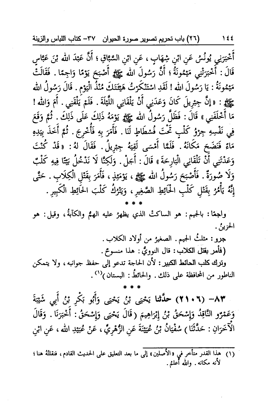 [2105] واجما بِالْجِيم هُوَ السَّاكِت الَّذِي يظْهر عَلَيْهِ الْهم والكآبة وَقيل هُوَ الحزين جرو مثلث الْجِيم الصَّغِير من أَوْلَاد الْكلاب فَأمر بقتل الْكلاب قَالَ النَّوَوِيّ هَذَا مَنْسُوخ وَترك كلب الْحَائِط الْكَبِير لِأَن الْحَاجة تَدْعُو إِلَى حفظ جوانبه وَلَا يتَمَكَّن الناطور من الْمُحَافظَة على ذَلِك والحائط الْبُسْتَان