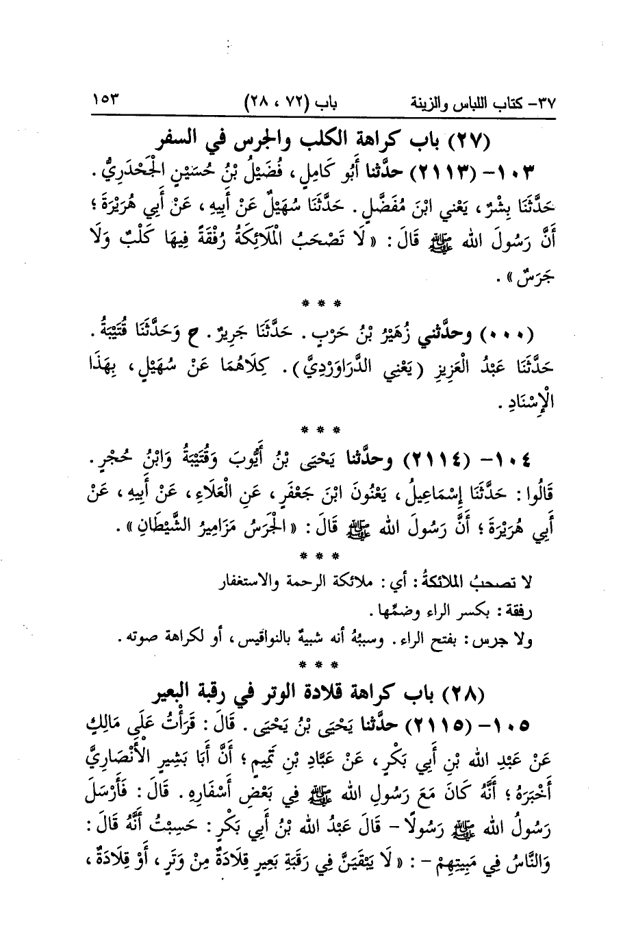 [2114] لَا تصْحَب الْمَلَائِكَة أَي مَلَائِكَة الرَّحْمَة وَالِاسْتِغْفَار رفْقَة بِكَسْر الرَّاء وَضمّهَا وَلَا جرس بِفَتْح الرَّاء وَسَببه أَنه شَبيه بالنواقيس أَو لكَرَاهَة صَوته