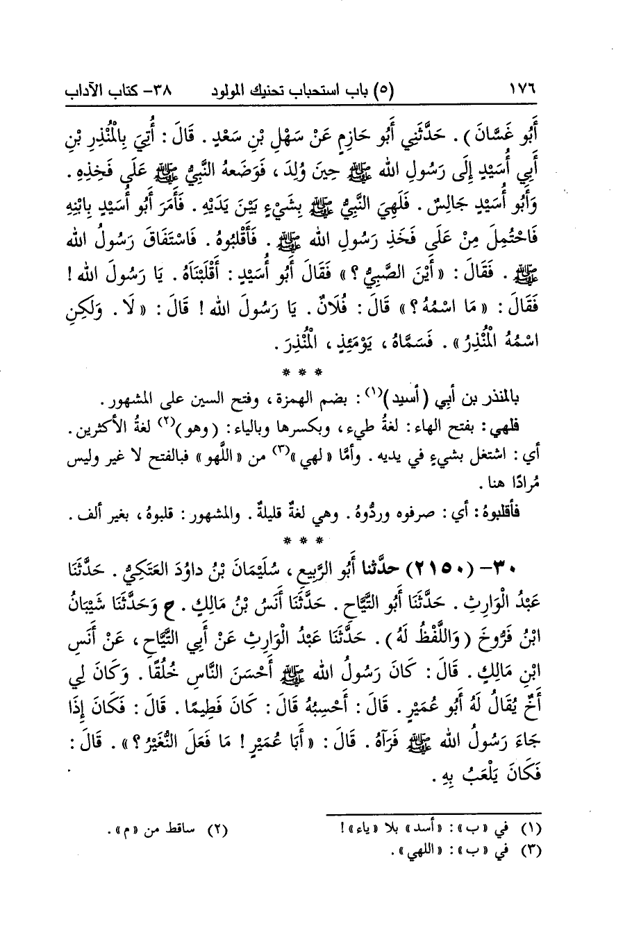 [2149] بالمنذر بن أبي أسيد بِضَم الْهمزَة وَفتح السِّين على الْمَشْهُور فلهي بِفَتْح الْهَاء لُغَة طَيء وبكسرها وبالياء وَهُوَ لُغَة الْأَكْثَرين أَي اشْتغل بِشَيْء فِي يَدَيْهِ وَأما لهي من اللَّهْو فبالفتح لَا غير وَلَيْسَ مرَادا هُنَا فأقلبوه أَي صرفوه وردوه وَهِي لُغَة قَليلَة وَالْمَشْهُور قلبوه بِغَيْر ألف