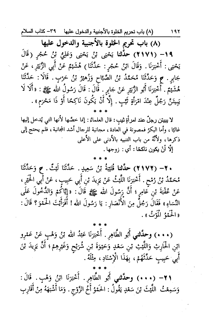 [2171] لَا يبيتن رجل عِنْد امْرَأَة ثيب قَالَ الْعلمَاء إِنَّمَا خصها لِأَنَّهَا الَّتِي يدْخل إِلَيْهَا غَالِبا وَأما الْبكر فمصونة فِي الْعَادة مجانبة للرِّجَال أَشد المجانبة فَلم يحْتَج إِلَى ذكرهَا وَلِأَنَّهُ من بَاب التَّنْبِيه بالأدنى على الْأَعْلَى إِلَّا أَن يكون ناكحا أَي زَوجهَا