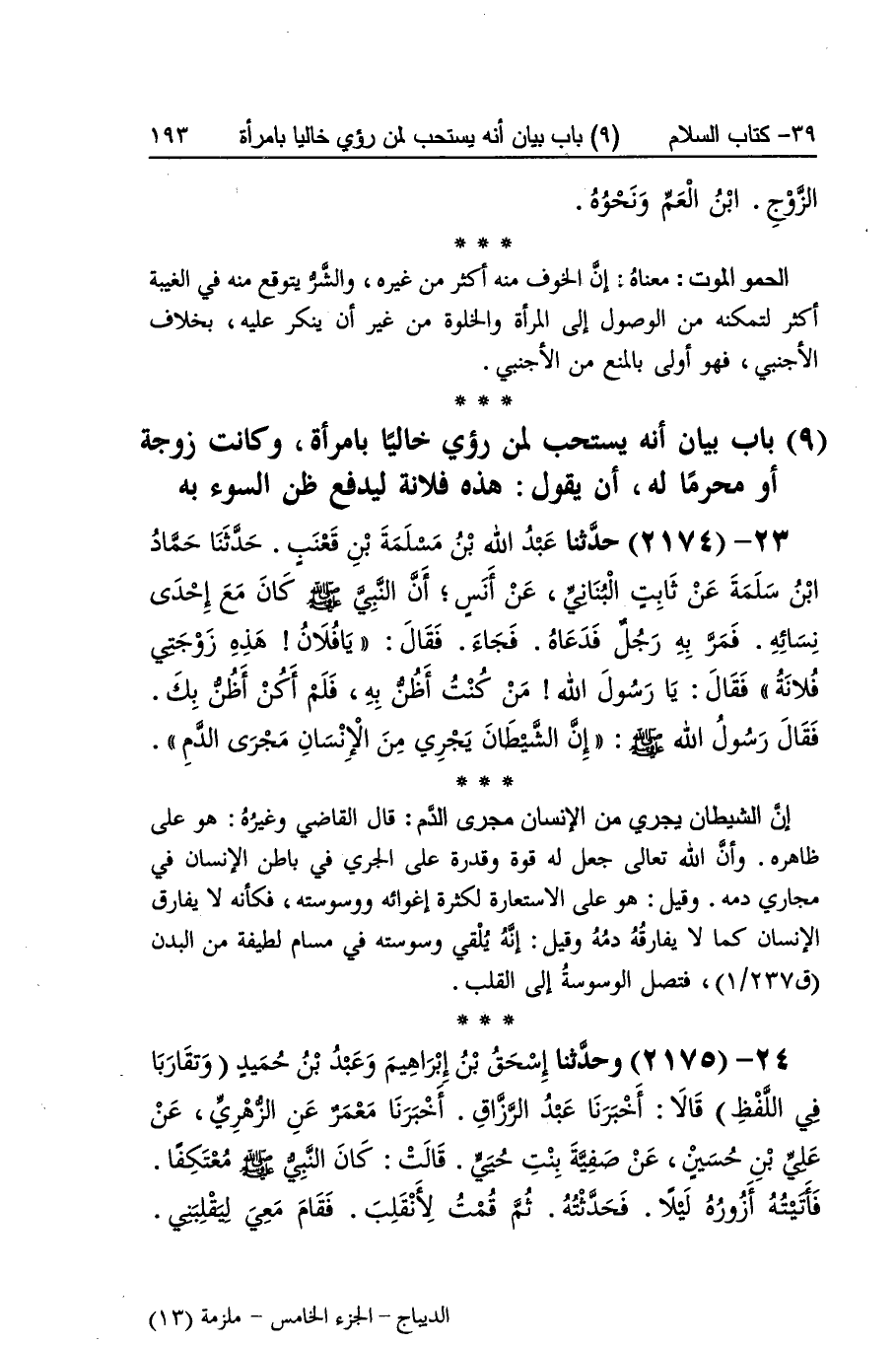 [2174] إِن الشَّيْطَان يجْرِي من الْإِنْسَان مجْرى الدَّم قَالَ القَاضِي وَغَيره هُوَ على ظَاهره وَأَن الله تَعَالَى جعل لَهُ قُوَّة وقدرة على الجري فِي بَاطِن الْإِنْسَان فِي مجاري دَمه وَقيل هُوَ على الِاسْتِعَارَة لِكَثْرَة إغوائه ووسوسته فَكَأَنَّهُ لَا يُفَارق الْإِنْسَان كَمَا لَا يُفَارِقهُ دَمه وَقيل إِنَّه يلقِي وسوسته فِي مسام لَطِيفَة من الْبدن فتصل الوسوسة إِلَى الْقلب