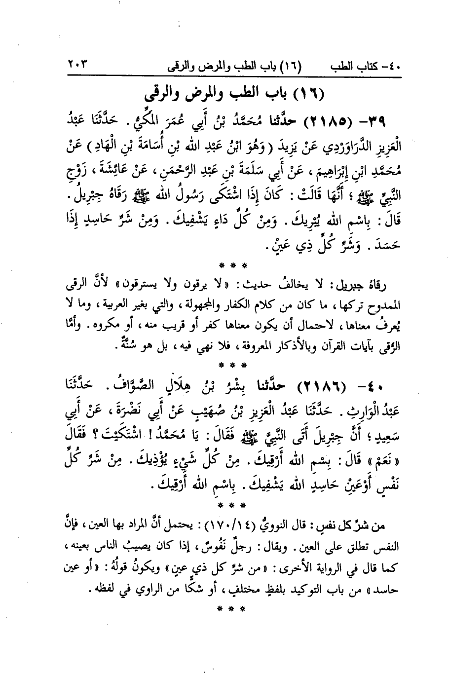 [2185] رقاه جِبْرِيل لَا يُخَالف حَدِيث لَا يرقون وَلَا يسْتَرقونَ لِأَن الرقي الممدوح تَركهَا مَا كَانَ من كَلَام الْكفَّار والمجهولة وَالَّتِي بِغَيْر الْعَرَبيَّة وَمَا لَا يعرف مَعْنَاهَا لاحْتِمَال أَن يكون مَعْنَاهَا كفر أَو قريب مِنْهُ أَو مَكْرُوه واما الرقي بآيَات الْقُرْآن وبالأذكار الْمَعْرُوفَة فَلَا نهي فِيهِ بل هُوَ سنة