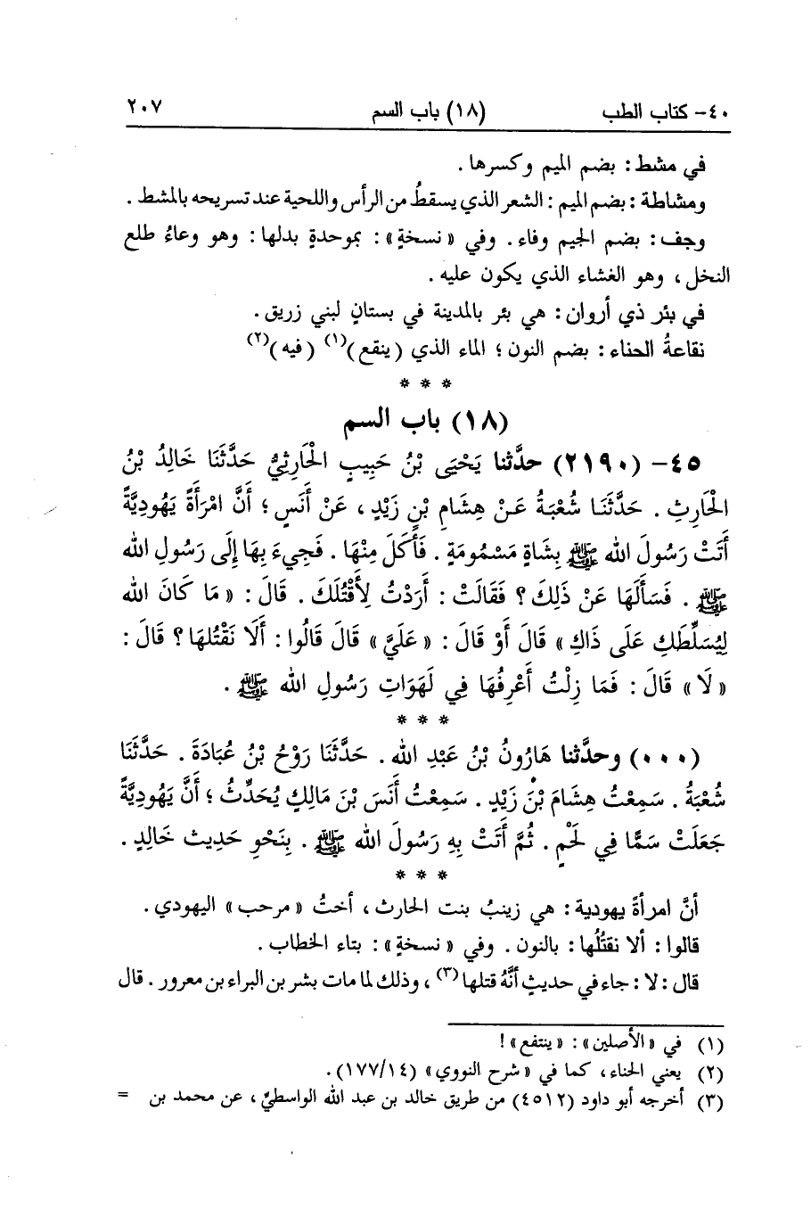 [2189] من يهود بني زُرَيْق بِتَقْدِيم الزَّاي مطبوب أَي مسحور فِي مشط بِضَم الْمِيم وَكسرهَا ومشاطة بِضَم الْمِيم الشّعْر الَّذِي يسْقط من الرَّأْس واللحية عِنْد تسريحه بالمشط وجف بِضَم الْجِيم وَفَاء وَفِي نُسْخَة بموحدة بدلهَا وَهُوَ وعَاء طلع النّخل وَهُوَ الغشاء الَّذِي يكون عَلَيْهِ فِي بِئْر ذِي أروان هِيَ بِئْر بِالْمَدِينَةِ فِي بُسْتَان لبني زُرَيْق نقاعة الْحِنَّاء بِضَم النُّون المَاء الَّذِي ينقع فِيهِ