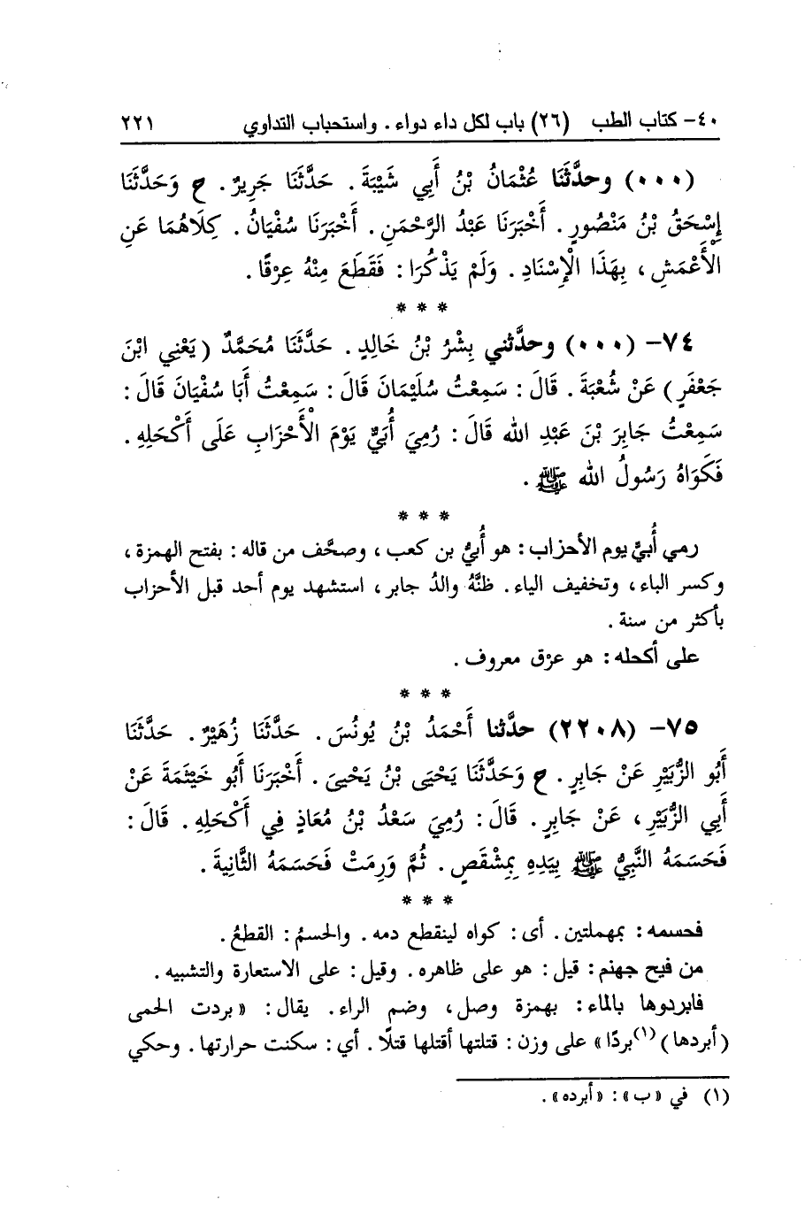 [2207] رمي أبي يَوْم الْأَحْزَاب هُوَ أبي بن كَعْب وصحف من قَالَه بِفَتْح الْهمزَة وَكسر الْبَاء وَتَخْفِيف الْيَاء ظَنّه وَالِد جَابر اسْتشْهد يَوْم أحد قبل الْأَحْزَاب بِأَكْثَرَ من سنة على أكحله هُوَ عرق مَعْرُوف