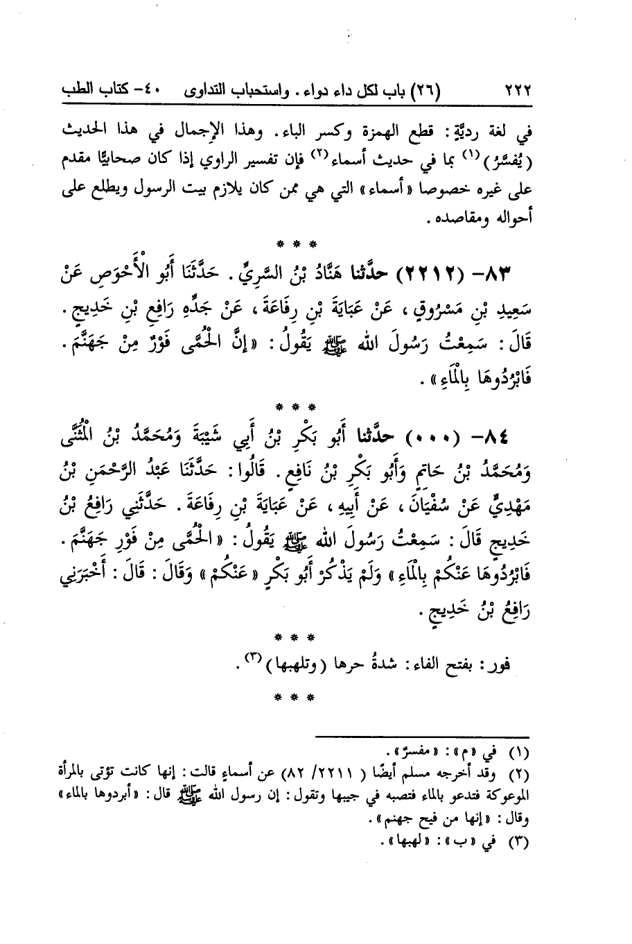 [2208] فحسمه بمهملتين أَي كواه لينقطع دَمه والحسم الْقطع من فيح جَهَنَّم قيل هُوَ على ظَاهره وَقيل على الِاسْتِعَارَة والتشبيه فَأَبْرِدُوهَا بِالْمَاءِ بِهَمْزَة وصل وَضم الرَّاء يُقَال بردت الْحمى أبردها بردا على وزن قتلتها أقتلها قتلا أَي سكنت حَرَارَتهَا وَحكي فِي لُغَة ردية قطع الْهمزَة وَكسر الْبَاء وَهَذَا الْإِجْمَال فِي هَذَا الحَدِيث يُفَسر بِمَا فِي حَدِيث أَسمَاء فَإِن تَفْسِير الرَّاوِي إِذا كَانَ صحابيا مقدم على غَيره خُصُوصا أَسمَاء الَّتِي هِيَ مِمَّن كَانَ يلازم بَيت الرَّسُول ويطلع على أَحْوَاله ومقاصده