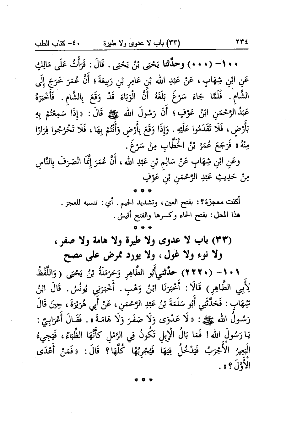 [2219] بسرغ بِفَتْح السِّين الْمُهْملَة وَسُكُون الرَّاء وَحكي فتحهَا وغين مُعْجمَة بِالصرْفِ وَتَركه قَرْيَة فِي طرف الشَّام مِمَّا يَلِي الْحجاز أهل الأجناد قَالَ النَّوَوِيّ المُرَاد بالأجناد هُنَا مدن الشَّام الْخمس وَهِي فلسطين والأردن ودمشق وحمص وقنسرين قَالَ هَكَذَا فسروه وَاتَّفَقُوا عَلَيْهِ الوباء مَهْمُوز بِالْقصرِ وَالْمدّ أفْصح وَأشهر قيل هُوَ الطَّاعُون وَقيل كل مرض عَام قَالَ النَّوَوِيّ وَالصَّحِيح الَّذِي قَالَه الْمُحَقِّقُونَ إِنَّه مرض الكثيرين من النَّاس فِي جِهَة من الأَرْض دون سَائِر الْجِهَات وَيكون مُخَالفا للمعتاد من الْأَمْرَاض الْكَثِيرَة وَغَيرهَا وَيكون مرضهم نوعا وَاحِدًا بِخِلَاف سَائِر الْأَوْقَات فَإِن أمراضهم فِيهَا مُخْتَلفَة وَقَالُوا كل طاعون وباء وَلَيْسَ كل وباء طاعونا قَالَ والوباء الَّذِي وَقع بِالشَّام فِي هَذَا الحَدِيث كَانَ طاعونا وَهُوَ طاعون عمواس الْمُهَاجِرين الْأَوَّلين قَالَ القَاضِي هم من صلى إِلَى الْقبْلَتَيْنِ فَأَما من أسلم بعد تَحْويل الْقبْلَة فَلَا يعد فيهم مهاجرة الْفَتْح قيل هم الَّذين أَسْلمُوا قبل الْفَتْح فَحصل لَهُم فضل بِالْهِجْرَةِ قبله إِذْ لَا هِجْرَة بعد الْفَتْح وَقيل هم مسلمة الْفَتْح الَّذين هَاجرُوا بعده فَحصل لَهُم اسْم الْهِجْرَة دون الْفَضِيلَة قَالَ القَاضِي وَهَذَا أظهر لأَنهم الَّذين ينطبق عَلَيْهِم مشيخة قُرَيْش إِنِّي مصبح بِسُكُون الصَّاد على ظهر أَي مُسَافِرًا رَاكِبًا على ظهر الرَّاحِلَة رَاجعا إِلَى الْمَدِينَة لَو غَيْرك قَالَهَا يَا أَبَا عُبَيْدَة جَوَاب لَو مَحْذُوف أَي لأذيته أَو لم أتعجب مِنْهُ عدوتان تَثْنِيَة عدوة بِضَم الْعين وَكسرهَا جَانب الْوَادي خصبة بِفَتْح أَوله وَسُكُون ثَانِيه وكسره جدبة بِفَتْح الْجِيم وَسُكُون الدَّال وَكسرهَا أَكنت معجزه بِفَتْح الْعين وَتَشْديد الْجِيم أَي تنسبه للعجز هَذَا الْمحل بِفَتْح الْحَاء وكسره وَالْفَتْح أَقيس