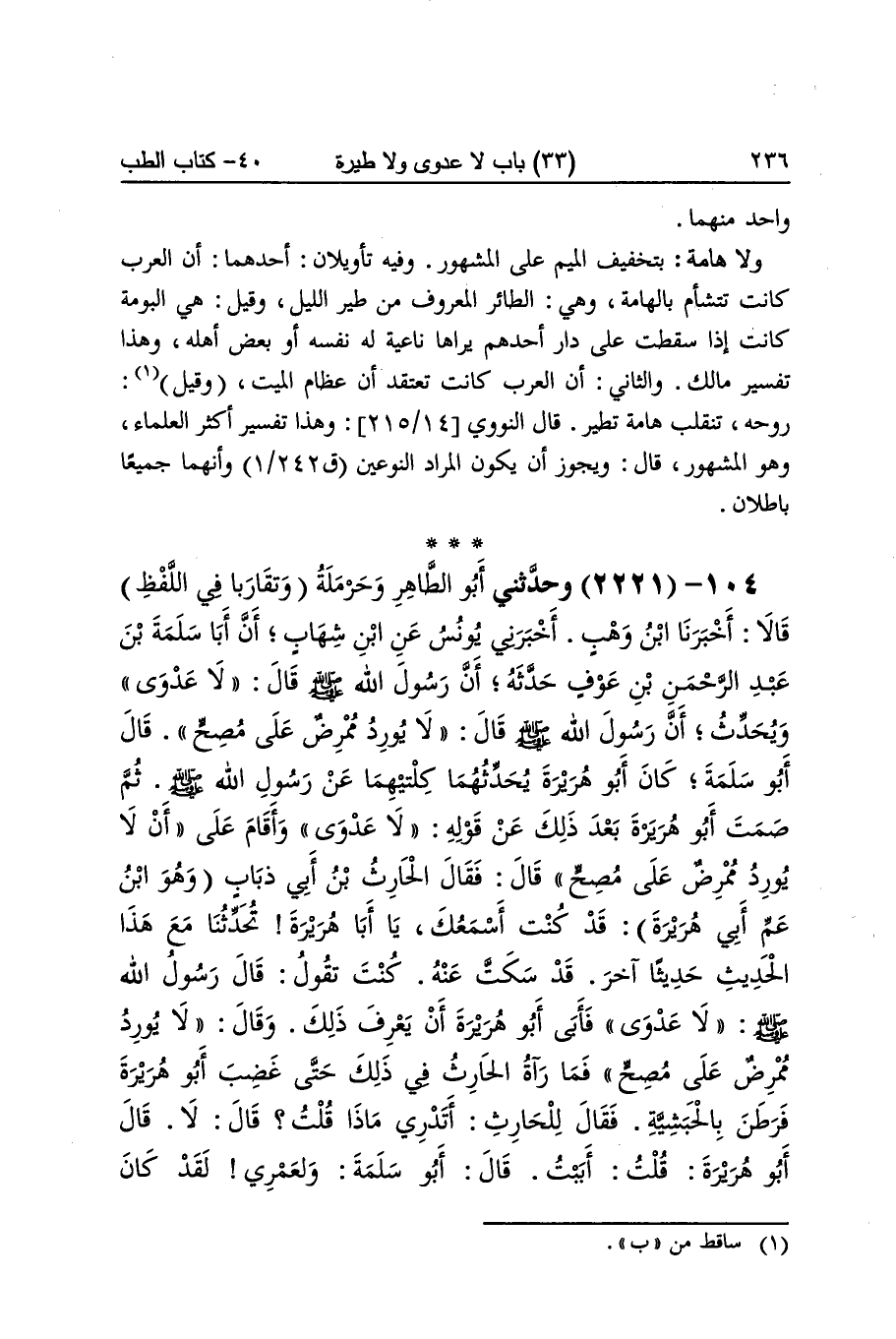 [2220] لَا عدوى قيل هُوَ نهي عَن أَن يُقَال ذَلِك أَو يعْتَقد وَقيل هُوَ خبر أَي لَا تقع عدوى بطبعها وَلَا صفر فِيهِ تَأْوِيلَانِ أَحدهمَا أَن المُرَاد تأخيرهم تَحْرِيم الْمحرم إِلَى صفر وَهُوَ النسيء الَّذِي كَانُوا يَفْعَلُونَهُ وَبِهَذَا قَالَ مَالك وَأَبُو عُبَيْدَة وَالثَّانِي أَن الصفر دَوَاب فِي الْبَطن وَهِي دود كَانُوا يَعْتَقِدُونَ أَن فِي الْبَطن دَابَّة تهيج عِنْد الْجُوع وَرُبمَا قتلت صَاحبهَا وَكَانَت الْعَرَب ترَاهَا أعدى من الجرب قَالَ النَّوَوِيّ وَهَذَا التَّفْسِير هُوَ الصَّحِيح وَبِه قَالَ مطرف وَابْن وهب وَابْن جرير وَأَبُو عبيد وخلائق قَالَ وَيجوز أَن يكون المُرَاد هَذَا وَالْأول جَمِيعًا وَأَن الصفرين جَمِيعًا باطلان لَا أصل لَهما وَلَا تعريج على وَاحِد مِنْهُمَا وَلَا هَامة بتَخْفِيف الْمِيم على الْمَشْهُور وَفِيه تَأْوِيلَانِ أَحدهمَا أَن الْعَرَب كَانَت تتشأم بالهامة وَهِي الطَّائِر الْمَعْرُوف من طير اللَّيْل وَقيل هِيَ البومة كَانَت إِذا سَقَطت على دَار أحدهم يَرَاهَا ناعية لَهُ نَفسه أَو بعض أَهله وَهَذَا تَفْسِير مَالك وَالثَّانِي أَن الْعَرَب كَانَت تعتقد أَن عِظَام الْمَيِّت وَقيل روحه تنْقَلب هَامة تطير قَالَ النَّوَوِيّ وَهَذَا تَفْسِير أَكثر الْعلمَاء وَهُوَ الْمَشْهُور قَالَ وَيجوز أَن يكون المُرَاد النَّوْعَيْنِ وأنهما جَمِيعًا باطلان