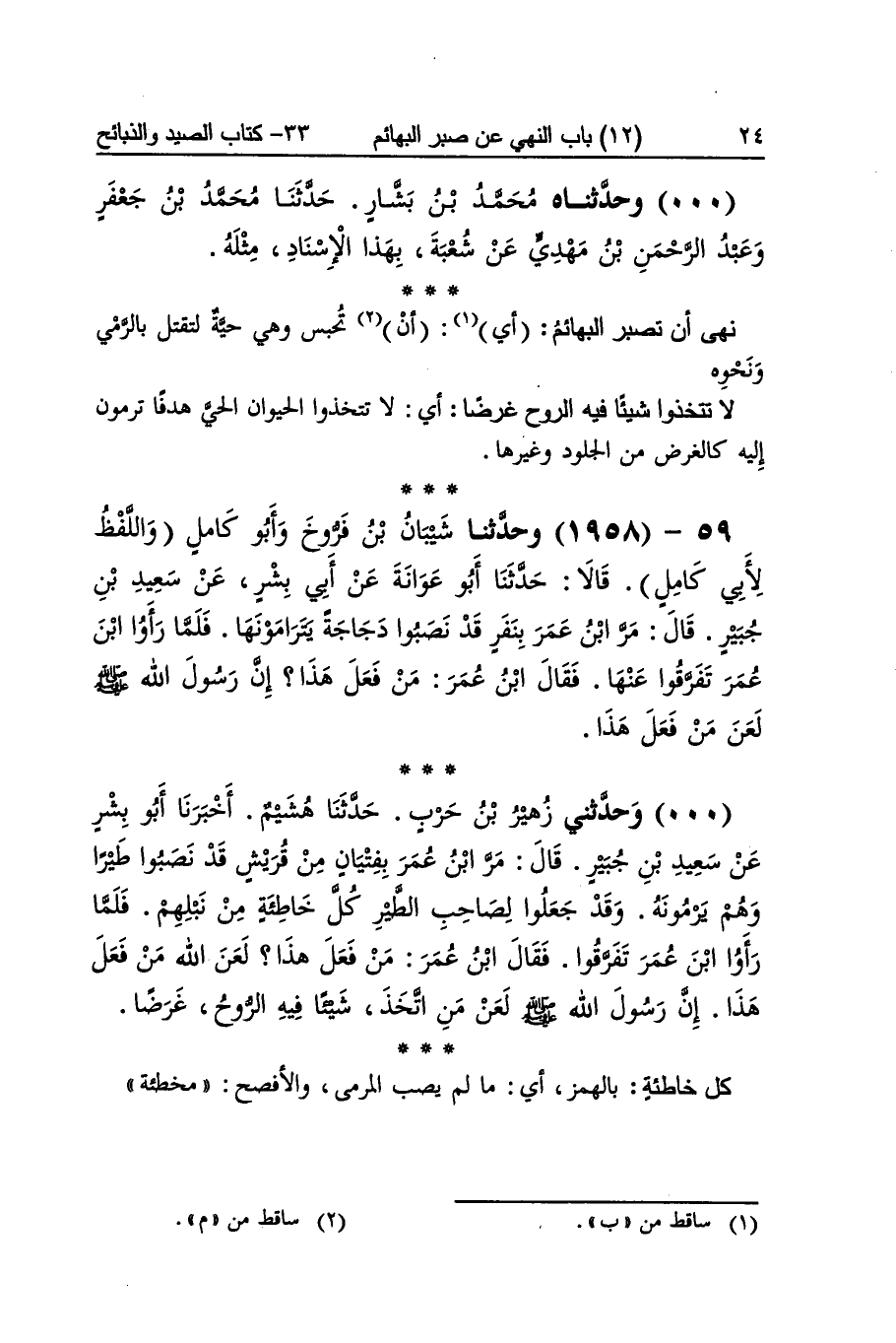 [1957] نهى أَن تصبر الْبَهَائِم أَي أَن تحبس وَهِي حَيَّة لتقتل بِالرَّمْي وَنَحْوه لَا تتَّخذ شَيْئا فِيهِ الرّوح غَرضا أَي لَا تَتَّخِذُوا الْحَيَوَان الْحَيّ هدفا ترمون إِلَيْهِ كالغرض من الْجُلُود وَغَيرهَا