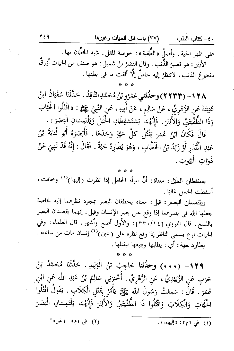 [2232] ذِي الطفيتين بِضَم الطَّاء الْمُهْملَة وَسُكُون الْفَاء وهما الخطان الأبيضان على ظهر الْحَيَّة وأصل الطفية خوصَة الْمقل شبه الخطان بهَا الأبتر هُوَ قصير الذَّنب وَقَالَ النَّضر بن شُمَيْل هُوَ صنف من الْحَيَّات أَزْرَق مَقْطُوع الذَّنب لَا تنظر إِلَيْهِ حَامِل إِلَّا أَلْقَت مَا فِي بَطنهَا