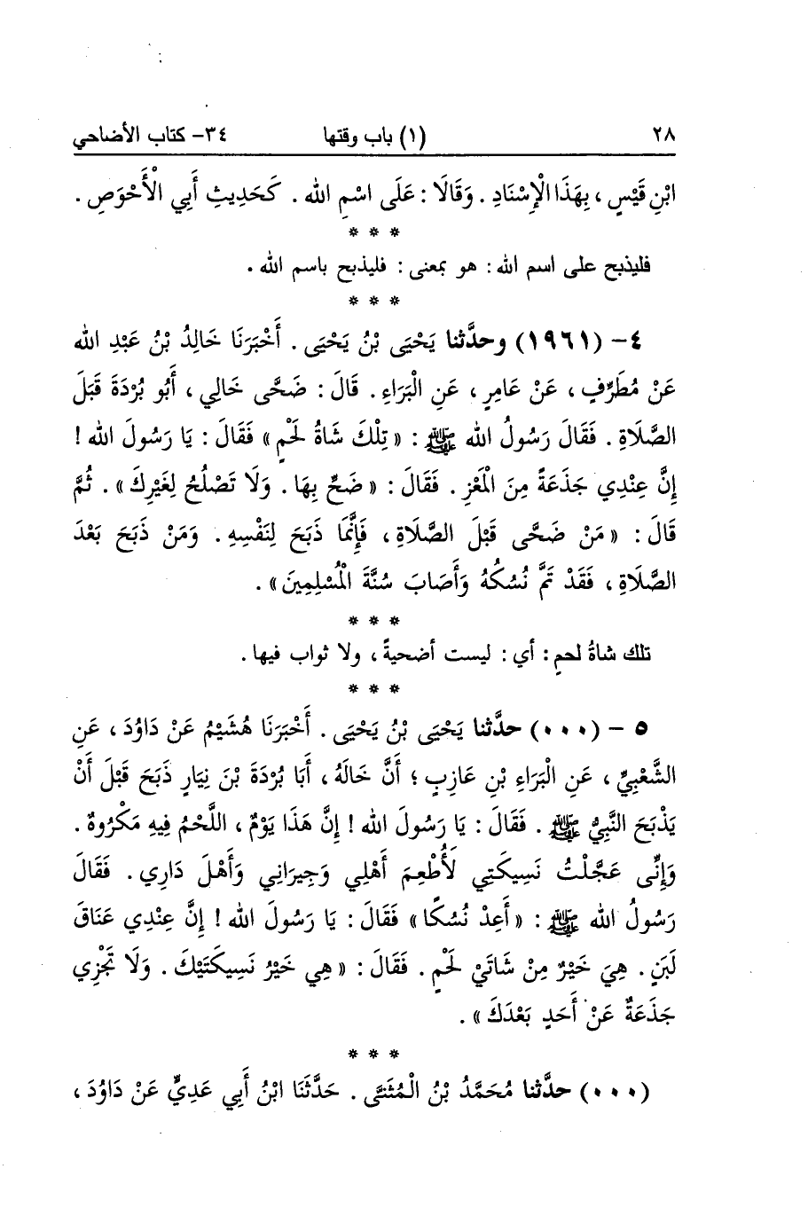 [1960] قبل أَن يُصَلِّي أَو نصلي الأولى بِالْيَاءِ وَالثَّانيَِة بالنُّون قَالَ النَّوَوِيّ 1311 وَالظَّاهِر أَنه شكّ من الرَّاوِي فليذبح باسم الله أَي قَائِلا بِسم الله قَالَ النَّوَوِيّ هَذَا هُوَ الصَّحِيح فِي مَعْنَاهُ فيلذبح علىاسم الله هُوَ بِمَعْنى فليذبح باسم الله