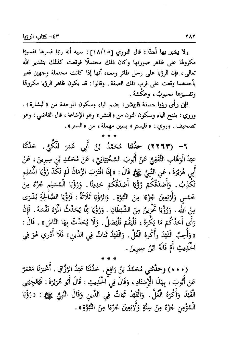 [2261] أعرى مِنْهَا بِضَم الْهمزَة وَسُكُون الْعين الْمُهْملَة وَفتح الرَّاء أَي أحم لخوفي من ظَاهرهَا فِي معرفتي يُقَال عرى الرجل بِضَم الْعين وَتَخْفِيف الرَّاء تعرى إِذا أَصَابَهُ عراء بِضَم الْعين وَالْمدّ وَهُوَ نفض الْحمى وَقيل رعدة لَا أزمل أَي أغطي وَألف كالمحموم الرُّؤْيَا بِالْقصرِ اسْم للمحبوبة من الله والحلم بِضَم الْحَاء وَسُكُون اللَّام اسْم للمكروهة من الشَّيْطَان قَالَ النَّوَوِيّ وَغَيره أضَاف الرُّؤْيَا المحبوبة إِلَى الله تَعَالَى إِضَافَة تشريف بِخِلَاف الْمَكْرُوهَة وَإِن كَانَتَا جَمِيعًا من خلق الله وتدبيره وبإرادته وَلَا فعل للشَّيْطَان فِيهَا لكنه يحضر الْمَكْرُوهَة ويرتضيها وَيسر بهَا حلم بِفَتْح اللَّام فلينفث بِضَم الْفَاء وَكسرهَا عَن يسَاره قَالَ القَاضِي طردا للشَّيْطَان الَّذِي حضر الرُّؤْيَا الْمَكْرُوهَة وتحقيرا لَهُ واستقذارا وليتعوذ بِاللَّه من شَرها ورد أَنه يَقُول اللَّهُمَّ إِنِّي أعوذ بك من عمل الشَّيْطَان وسيئات الأحلام رَوَاهُ بن السّني فِي عمل الْيَوْم وَاللَّيْلَة 77 فَإِنَّهَا لن تضره قَالَ النَّوَوِيّ جعل الله هَذَا سَببا لسلامته من مَكْرُوه يَتَرَتَّب عَلَيْهَا كَمَا جعل الصَّدَقَة وقاية لِلْمَالِ وسببا لدفع الْبلَاء يهب أَي يَسْتَيْقِظ الرُّؤْيَا الصَّالِحَة قَالَ القَاضِي يحْتَمل أَن معنى الصَّالِحَة والحسنة حسن ظاهرهاويحتمل أَن المُرَاد صِحَّتهَا قَالَ ورؤيا السوء يحْتَمل الْوَجْهَيْنِ أَيْضا سوء الظَّاهِر وَسُوء التَّأْوِيل وَلَا يخبر بهَا أحدا قَالَ النَّوَوِيّ سَببه أَنه رُبمَا فَسرهَا تَفْسِيرا مَكْرُوها على ظَاهر صورتهَا وَكَانَ ذَلِك مُحْتملا فَوَقَعت كَذَلِك بِتَقْدِير الله تَعَالَى فَإِن الرُّؤْيَا على رجل طَائِر وَمَعْنَاهُ أَنَّهَا إِذا كَانَت مُحْتَملَة وَجْهَيْن فَعبر بِأَحَدِهِمَا وَقعت على قرب تِلْكَ الصّفة وَقَالُوا قد يكون ظَاهر الرُّؤْيَا مَكْرُوها وتفسيرها مَحْبُوب وَعَكسه فَإِن رأى رُؤْيا حَسَنَة فليبشر بِضَم الْيَاء وَسُكُون الْمُوَحدَة من الْبشَارَة وَرُوِيَ بِفَتْح الْيَاء وَسُكُون النُّون من النشر وَهُوَ الإشاعة قَالَ القَاضِي وَهُوَ تَصْحِيف وَرُوِيَ فليستر بسين مُهْملَة من السّتْر