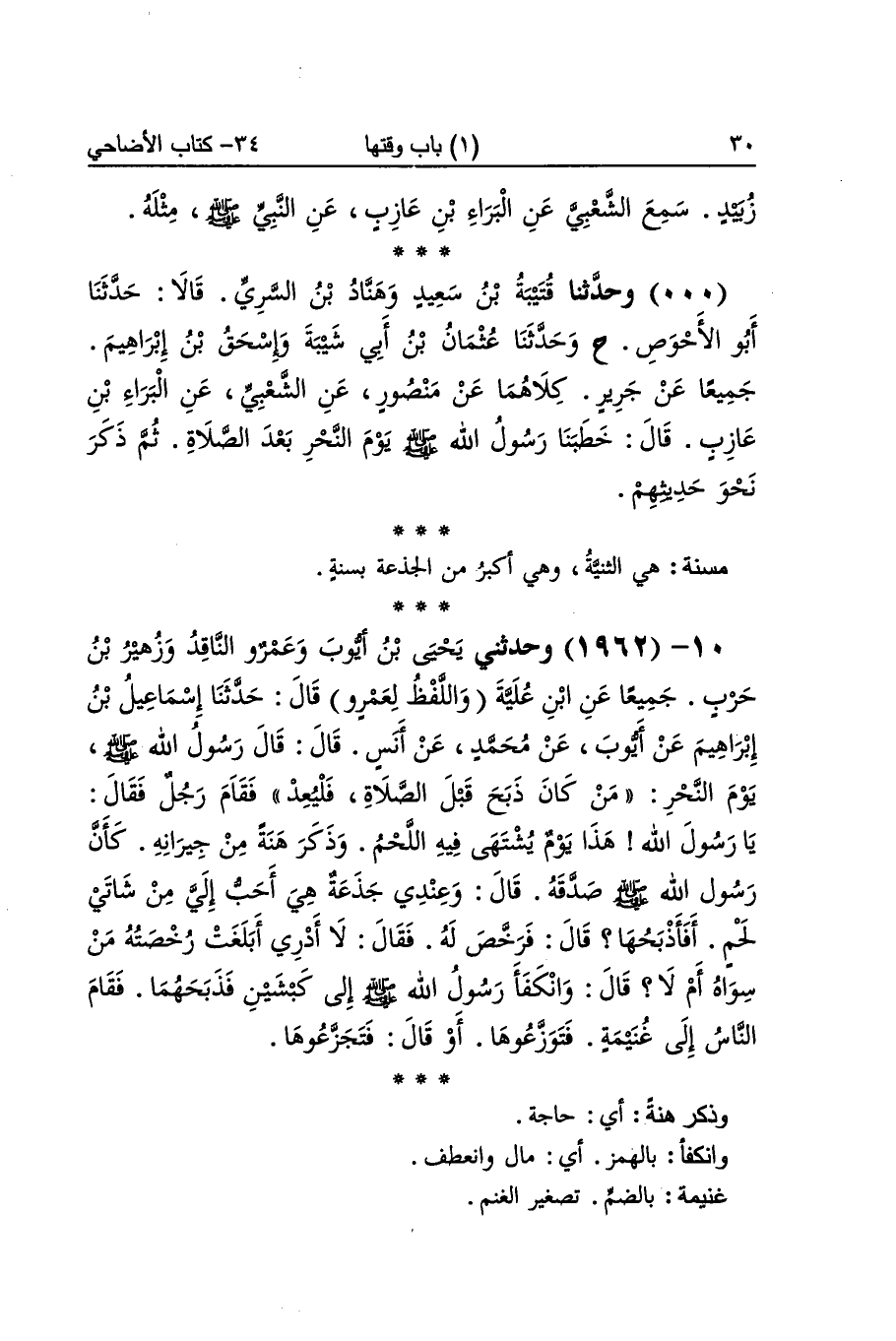 [1961] تِلْكَ شَاة لحم أَي لَيست أضْحِية وَلَا ثَوَاب فِيهَا إِن هَذَا يَوْم اللَّحْم فِيهِ مَكْرُوه فِي رِوَايَة العذري مقروم بِالْقَافِ وَالْمِيم أَي مشتهى قيل وَهُوَ الصَّوَاب وَأَن الأولى على فتح الْحَاء من اللَّحْم وَاللَّحم بِالْفَتْح اشتهاء اللَّحْم وَمَعْنَاهُ ترك اللَّحْم وَبَقَاء أَهله فِيهِ بِلَا لحم حِين يشتهوه مَكْرُوه وَقَالَ أَبُو مُوسَى الْمَدِينِيّ مَعْنَاهُ هَذَا يَوْم طلب اللَّحْم فِيهِ مَكْرُوه وشاق قَالَ النَّوَوِيّ وَهُوَ أحسن عنَاق بِفَتْح الْعين الْأُنْثَى من الْمعز إِذا قويت مَا لم تستكمل سنة وَقَوله عنَاق لبن أَي صَغِيرَة قريبَة مِمَّا ترْضع هِيَ خير نسيكتك أَي هَذِه وَالَّتِي ذبحت قبل الصَّلَاة وَلَا تُجزئ بِفَتْح التَّاء أَي لَا تَكْفِي مُسِنَّة هِيَ الثَّنية وَهِي أكبر من الْجَذعَة بِسنة