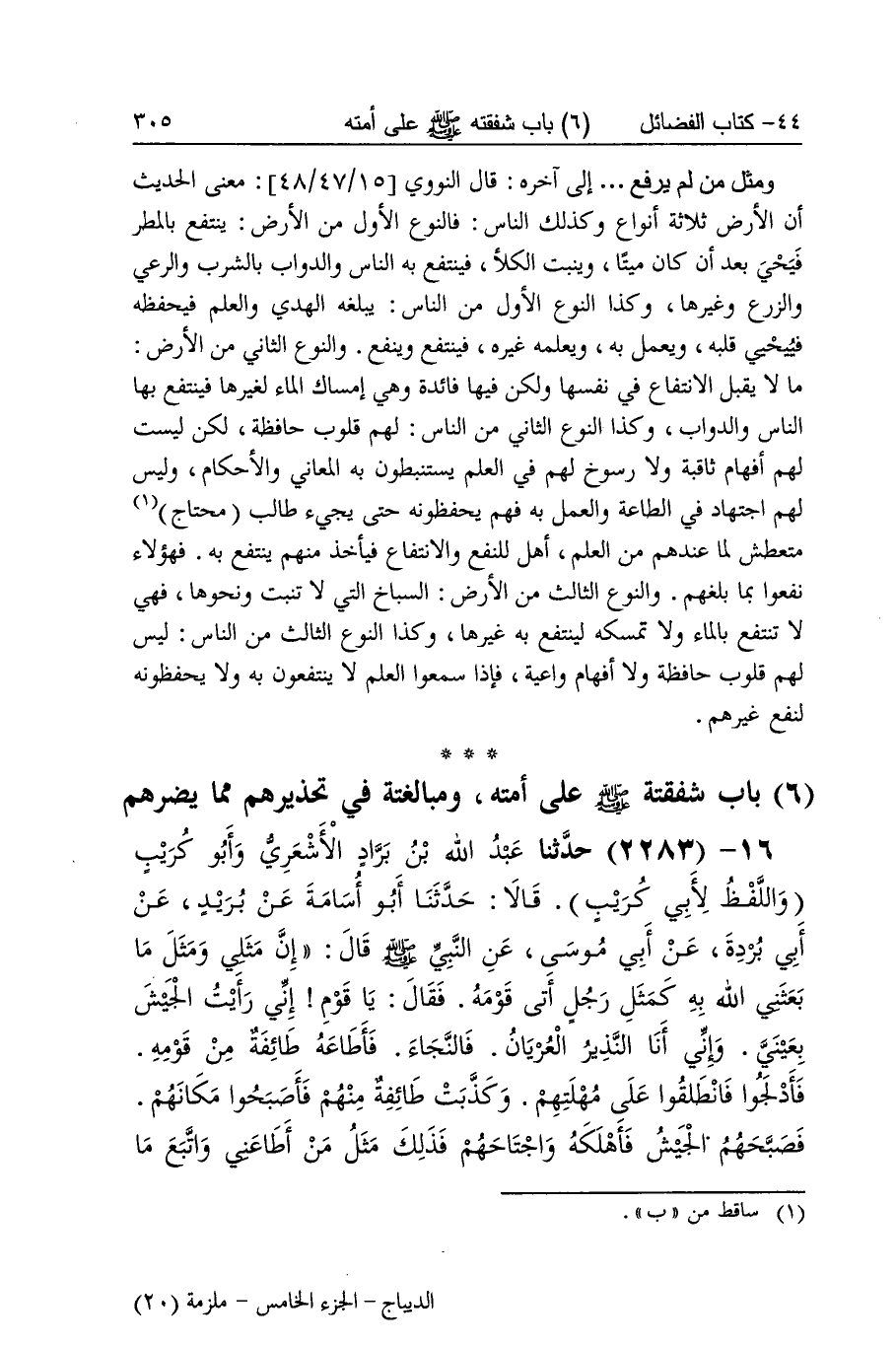 [2282] أجادب بِالْجِيم وَالدَّال الْمُهْملَة وَهِي الأَرْض الَّتِي لَا تنْبت الْكلأ وَتمسك المَاء فَلَا يسْرع فِيهَا النضوب جمع جَدب على غير قِيَاس ورعوا من الرَّعْي قيعان بِكَسْر الْقَاف جمع قاع وَهُوَ الأَرْض المستوية وَقيل الملساء وَقيل لَا نَبَات فِيهَا فقه رُوِيَ بِكَسْر الْقَاف وَبِضَمِّهَا وَالضَّم أشهر وَمثل من لم يرفع إِلَى أَخّرهُ قَالَ النَّوَوِيّ معنى الحَدِيث أَن الأَرْض ثَلَاثَة أَنْوَاع وَكَذَلِكَ النَّاس فالنوع الأول من الأَرْض ينْتَفع بالمطر فيحي بعد ان كَانَ مَيتا وينبت الْكلأ فينتفع بِهِ النَّاس وَالدَّوَاب بالشرب والرعي وَالزَّرْع وَغَيرهَا وَكَذَا النَّوْع الأول من النَّاس يبلغهُ الْهَدْي وَالْعلم فيحفظه فيحيي قلبه وَيعْمل بِهِ ويعلمه غَيره فينتفع وينفع وَالنَّوْع الثَّانِي من الأَرْض مَا لَا يقبل الِانْتِفَاع فِي نَفسهَا وَلَكِن فِيهَا فَائِدَة وَهِي إمْسَاك المَاء لغَيْرهَا فينتفع بهَا النَّاس وَالدَّوَاب وَكَذَا النَّوْع الثَّانِي من النَّاس لَهُم قُلُوب حافظة لَكِن لَيست لَهُم أفهام ثاقبة وَلَا رسوخ لَهُم فِي الْعلم يستنبطون بِهِ الْمعَانِي وَالْأَحْكَام وَلَيْسَ لَهُم اجْتِهَاد فِي الطَّاعَة وَالْعَمَل بِهِ فهم يَحْفَظُونَهُ حَتَّى يَجِيء طَالب مُحْتَاج متعطش لما عِنْدهم من الْعلم أهل للنفع وَالِانْتِفَاع فَيَأْخُذ مِنْهُم ينْتَفع بِهِ فَهَؤُلَاءِ نفعوا بِمَا بَلغهُمْ وَالنَّوْع الثَّالِث من الأَرْض السباخ الَّتِي لَا تنْبت وَنَحْوهَا فَهِيَ لَا تنْتَفع بِالْمَاءِ وَلَا تمسكه لينْتَفع بِهِ غَيرهَا وَكَذَا النَّوْع الثَّالِث من النَّاس لَيْسَ لَهُم قُلُوب حافظة وَلَا أفهام وَاعِيَة فَإِذا سمعُوا الْعلم لَا يَنْتَفِعُونَ بِهِ وَلَا يَحْفَظُونَهُ لنفع غَيرهم